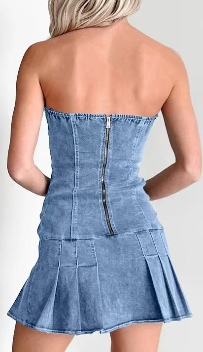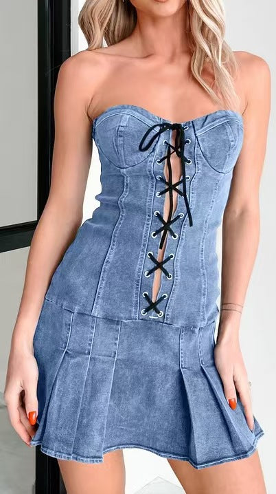 Women’s Denim Dress – Strapless Lace-Up Jean Mini with Pleated Skirt