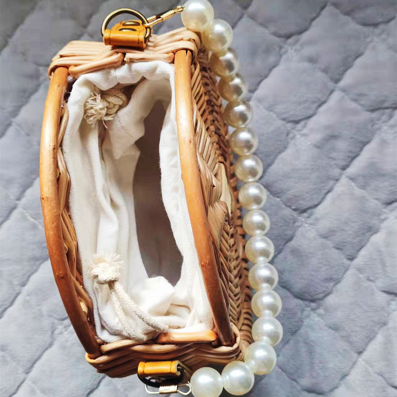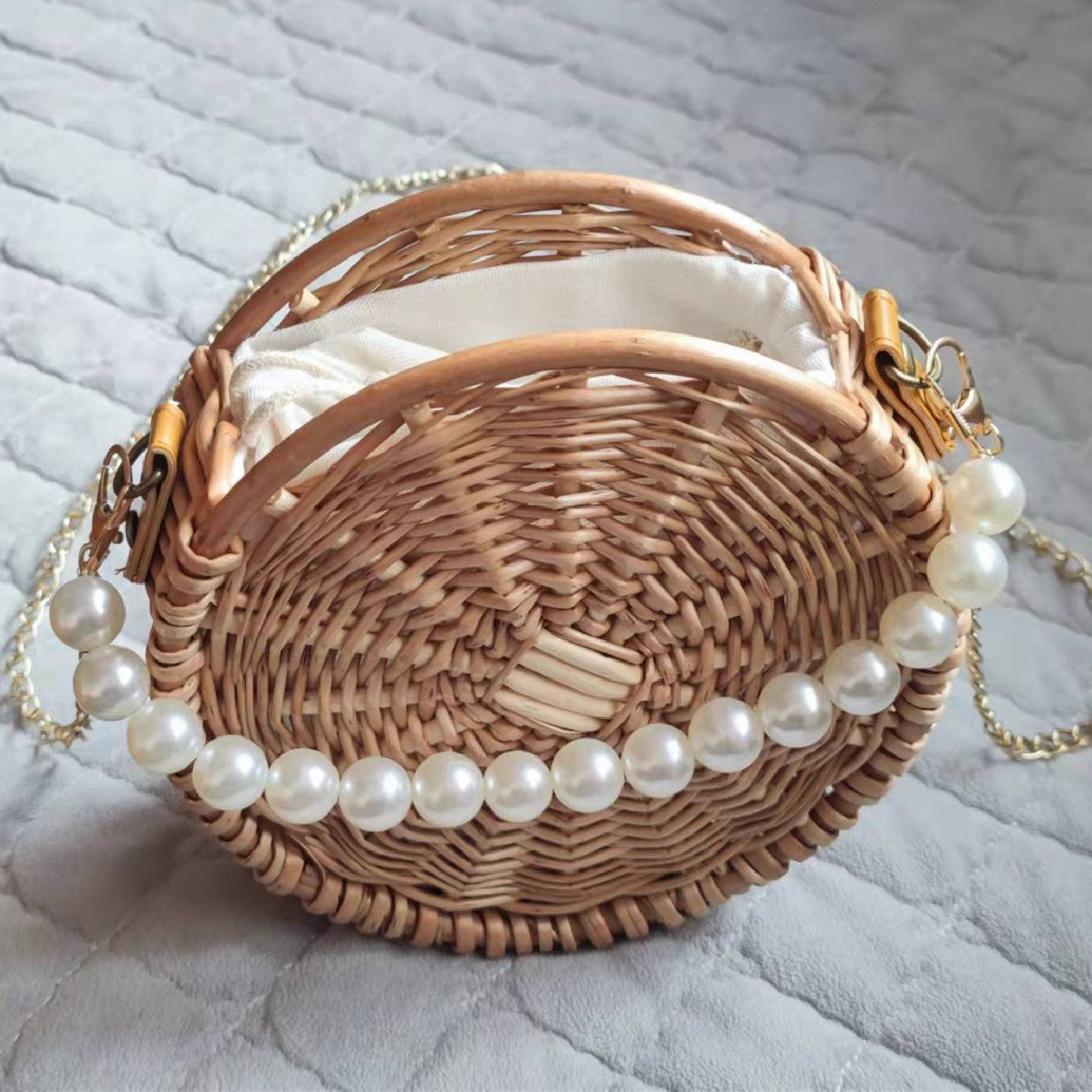 - Designer-inspired woven bag for women featuring pearl strap elegance