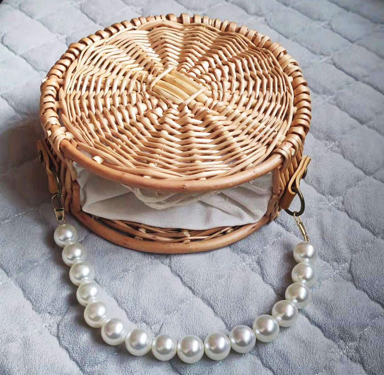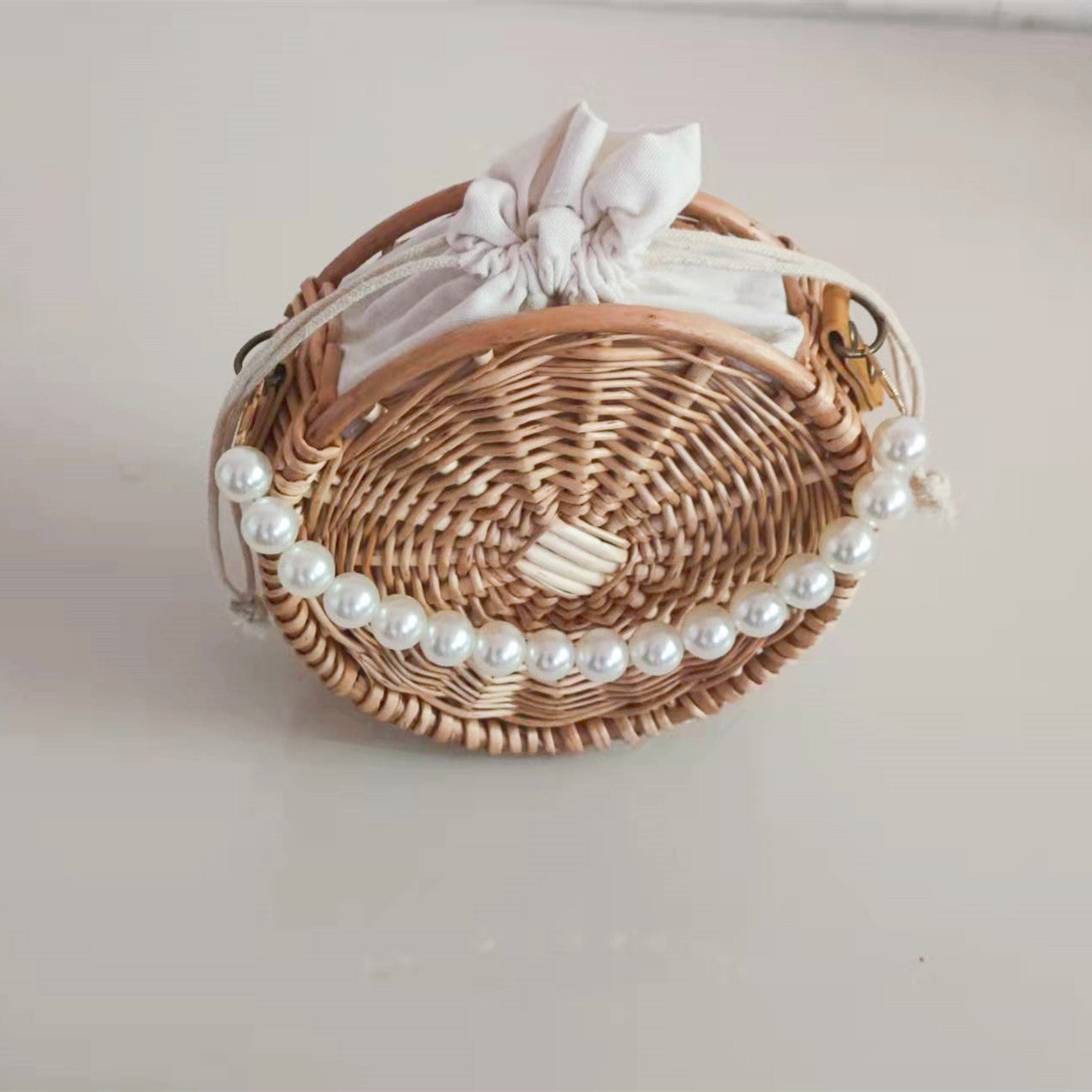 - Round woven bag design with pearl handle detail, perfect for summer outfits