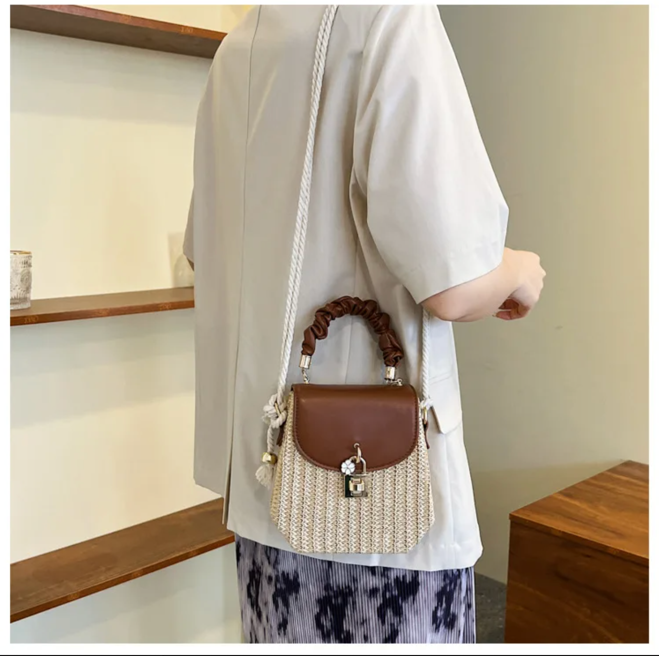 - Textured woven straw body paired with brown leather top flap for modern design