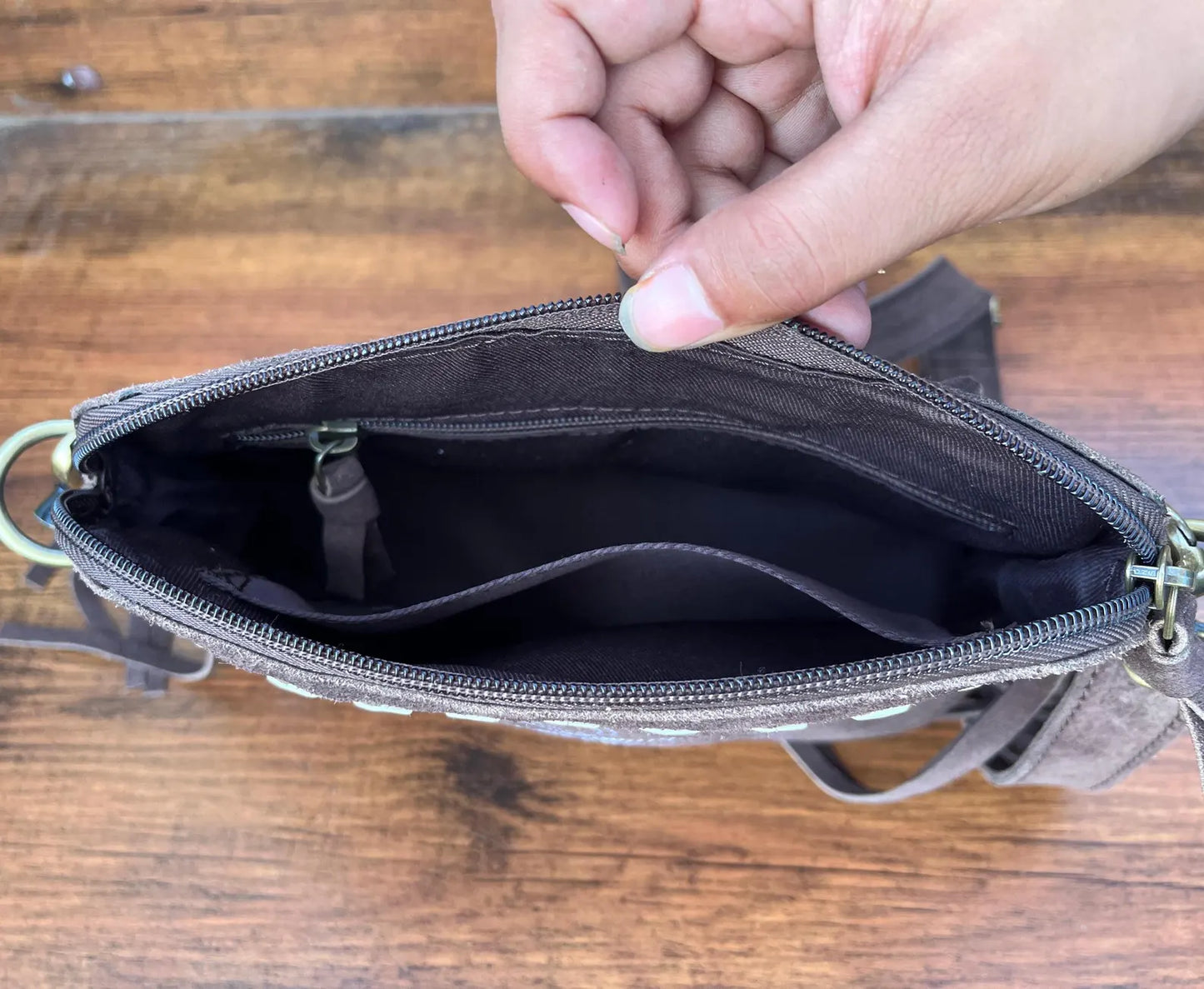 - Back Pocket: Features an additional back pocket with a secure leather zipper closure.