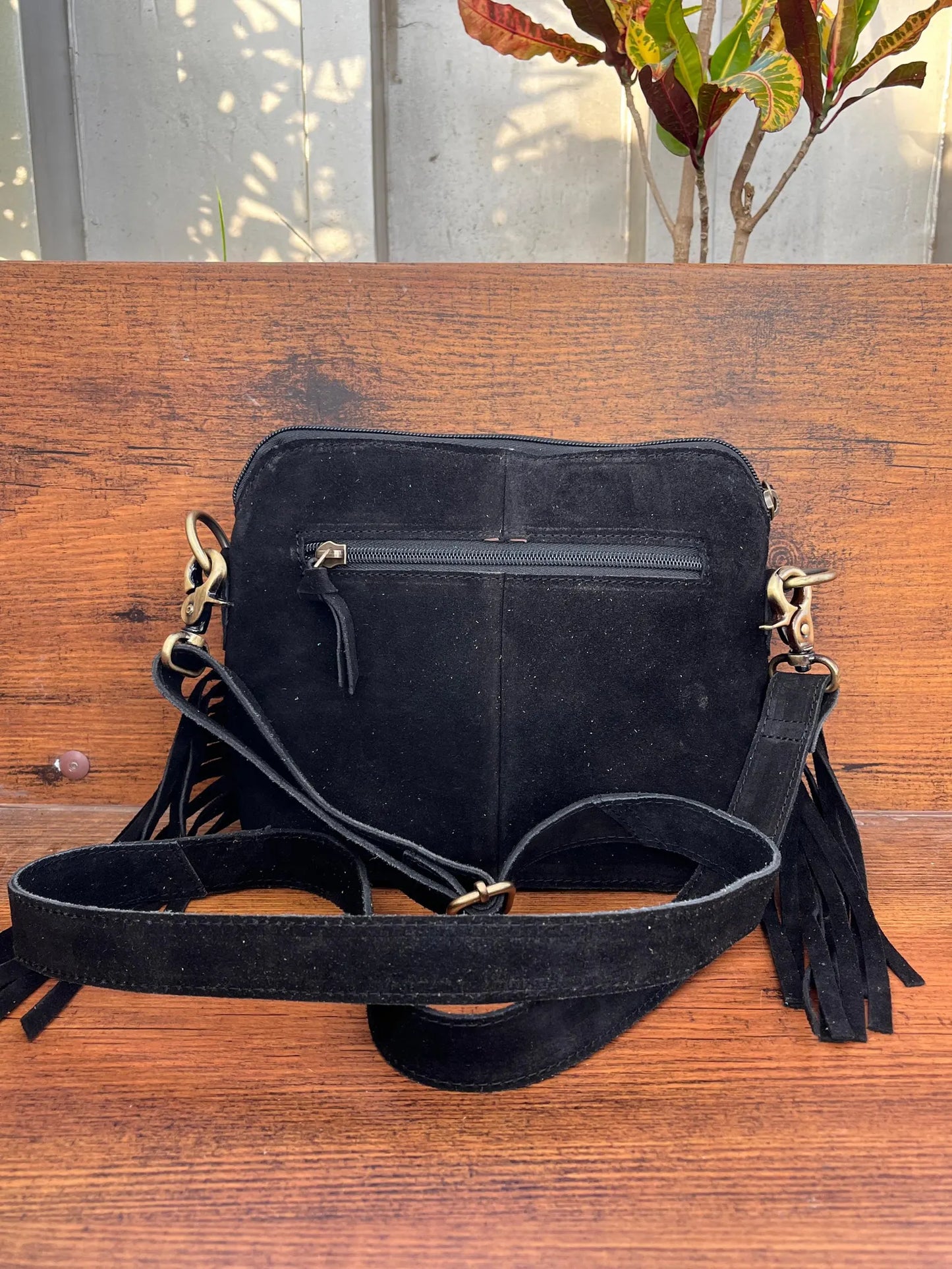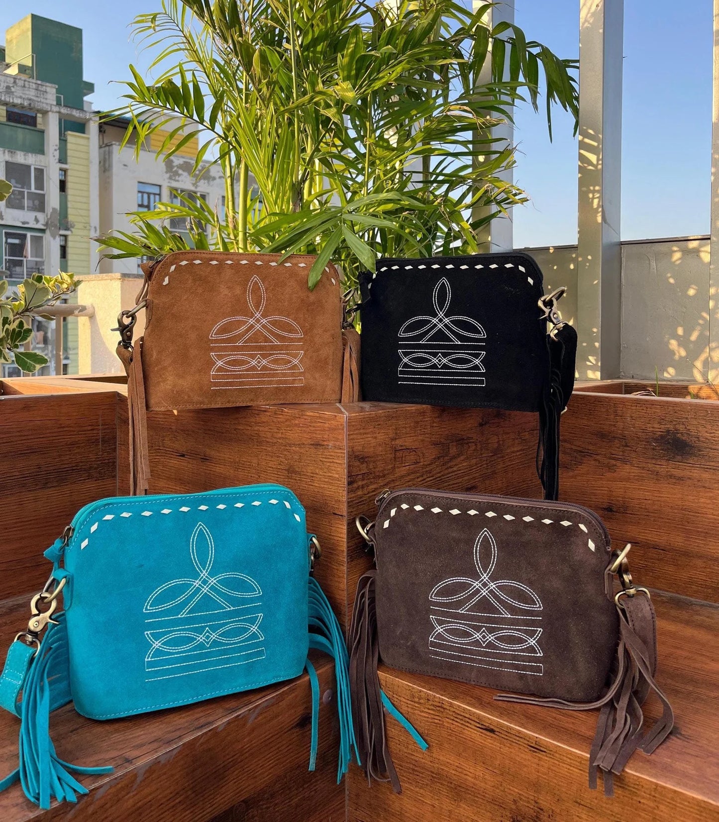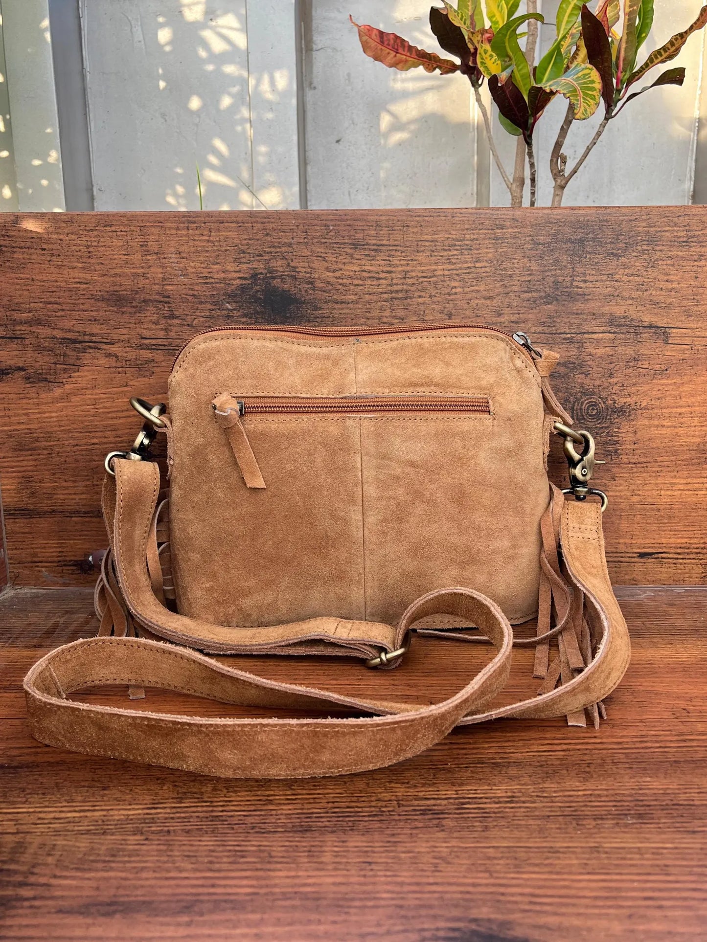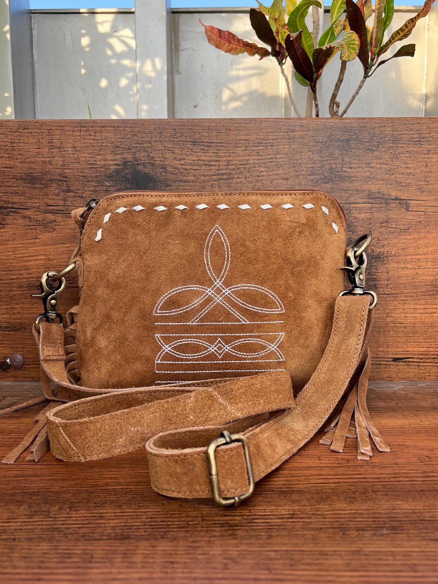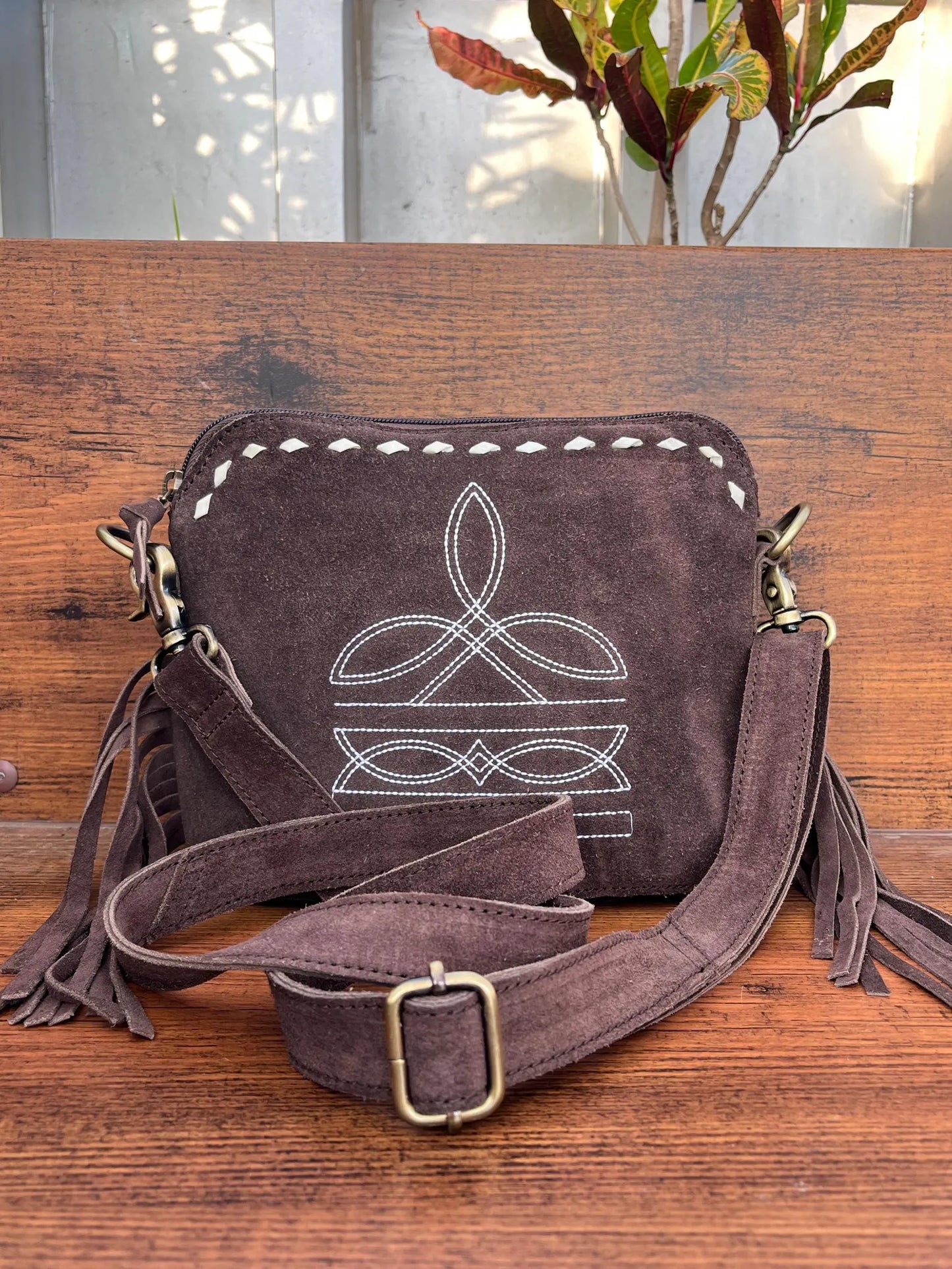 Timeless crossbody bag with suede leather, fringes, and embroidered buck stitch detailing.