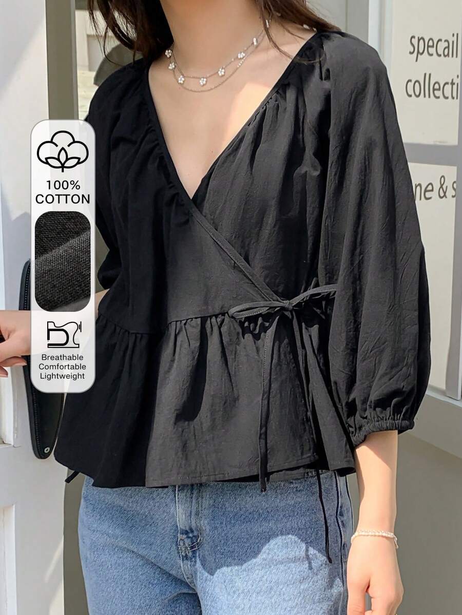 This women's tie side shirt is perfect for a range of events, from office meetings to social gatherings. The peplum design creates a flattering silhouette, while the wrap style adds a contemporary touch. Available in classic black and elegant white, it complements any wardrobe effortlessly.
