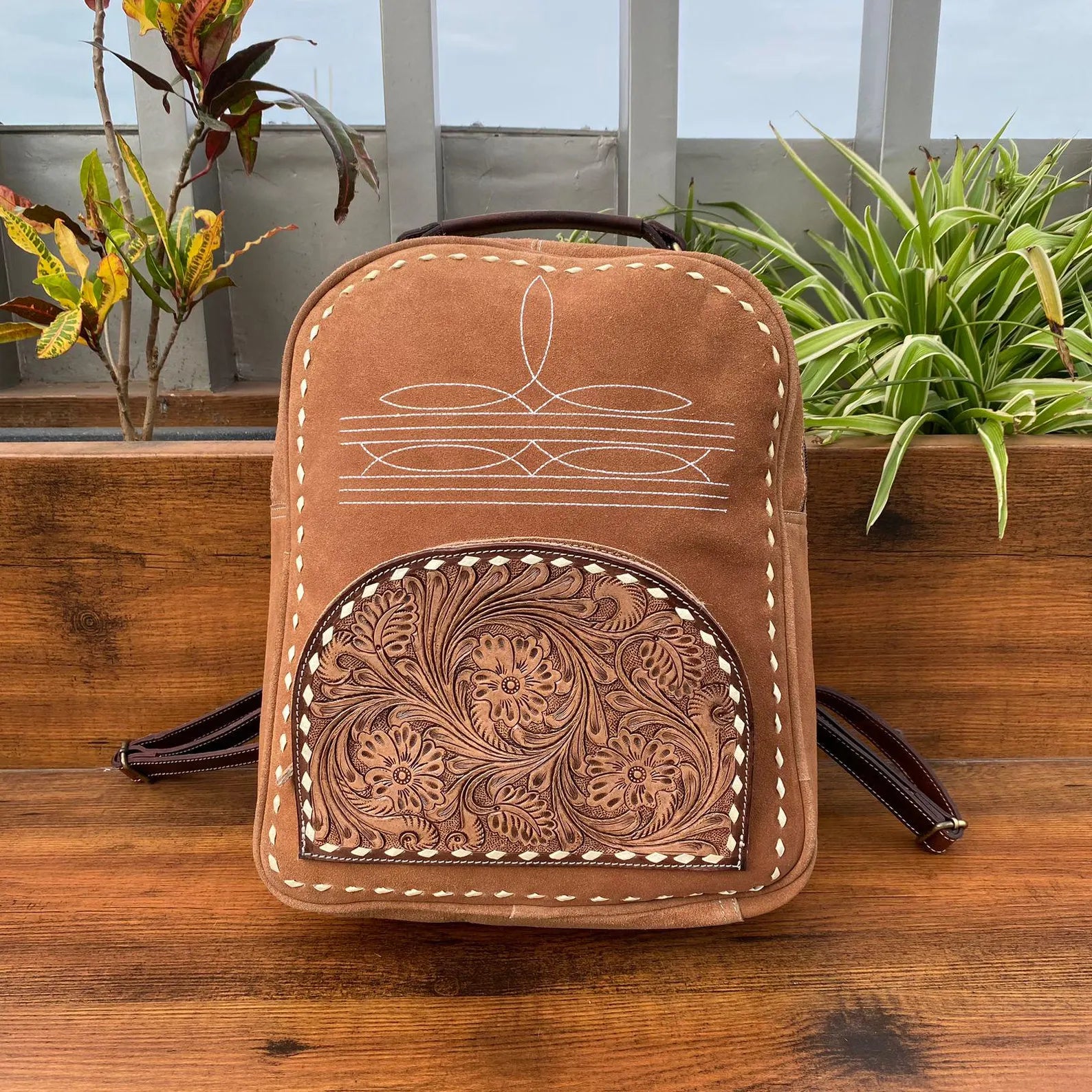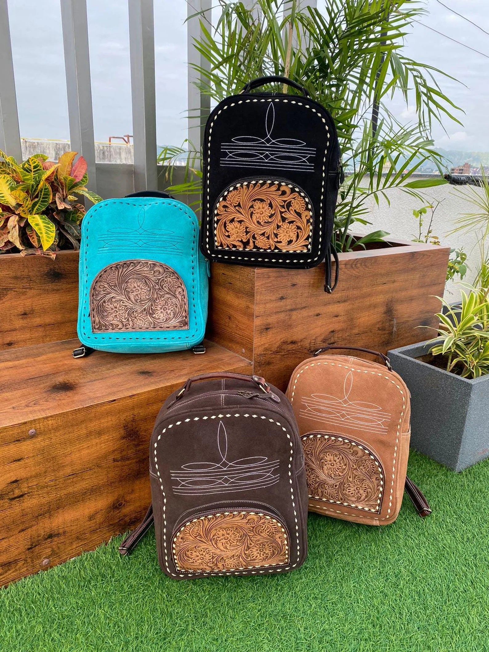 The suede leather backpack showcases a harmonious fusion of craftsmanship and practicality, perfectly tailored for modern needs while honoring traditional artistry. These backpacks are available in multiple vibrant shades, including deep black, rich brown, turquoise, and camel, each enhanced by the hand-tooled leatherwork and Western-inspired embroidery.
