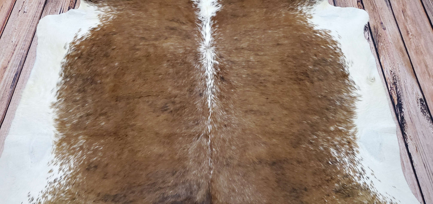 This western style tricolor cowhide rug is truly a stunning statement piece that is unlike any other. The rich reddish brown speckled markings, combined with the contrasting stripes and white background, create a mesmerizing and exotic effect on this cowhide rug. It is no surprise that this unique pattern has become one of our favorites and top-selling items.