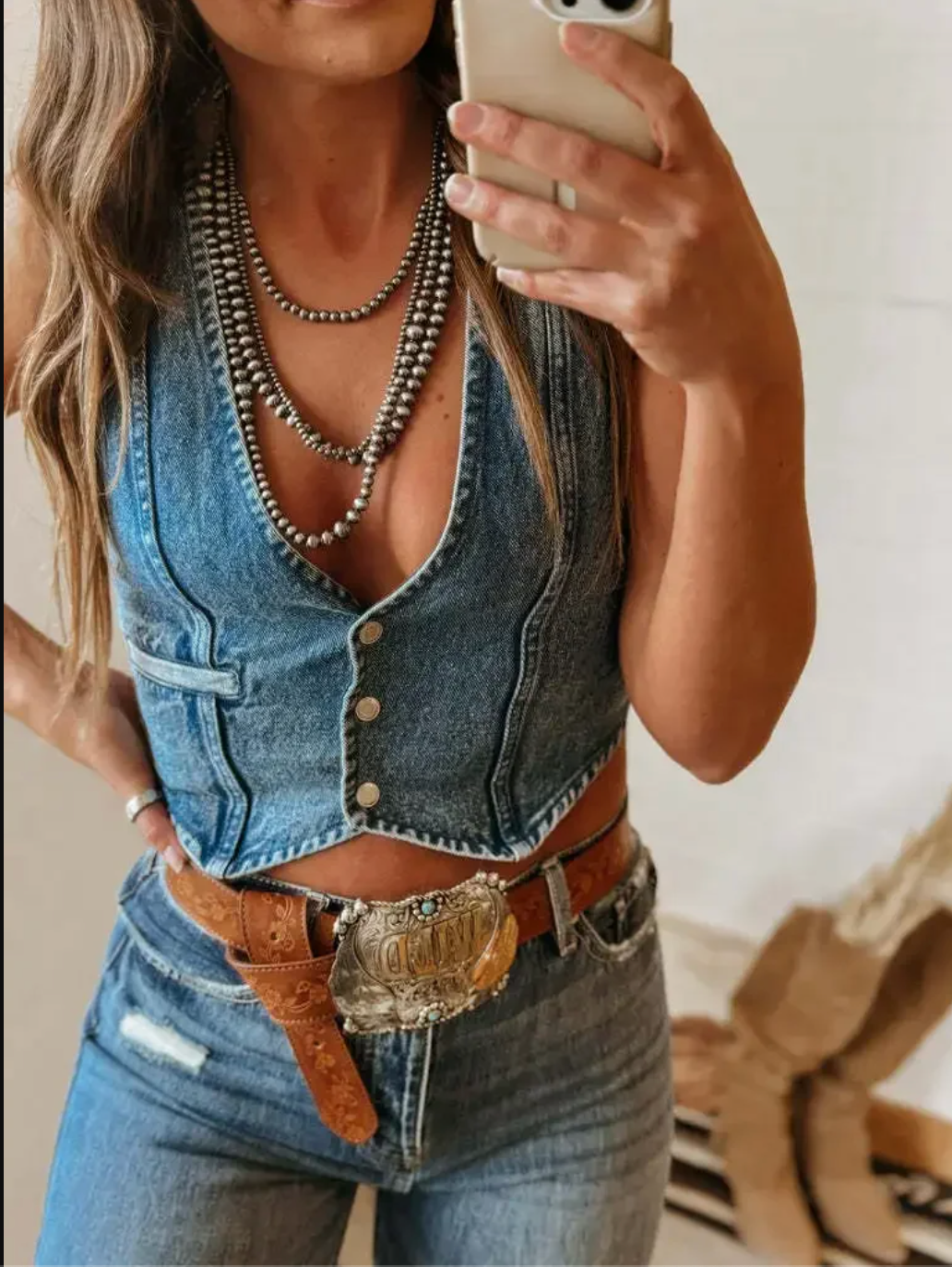 - Styled with engraved belt buckles and layered silver necklaces for complete cowgirl outfit ideas