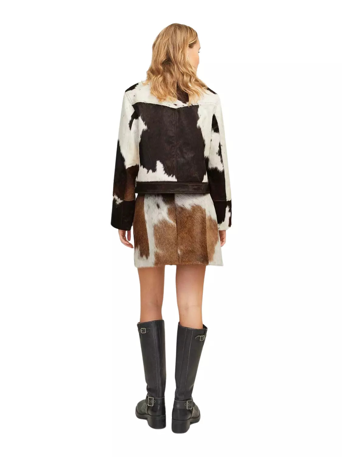 - Real tricolor cowhide skirt and cowhide jacket set – designed from authentic cow skin with visible hair-on-hide finish