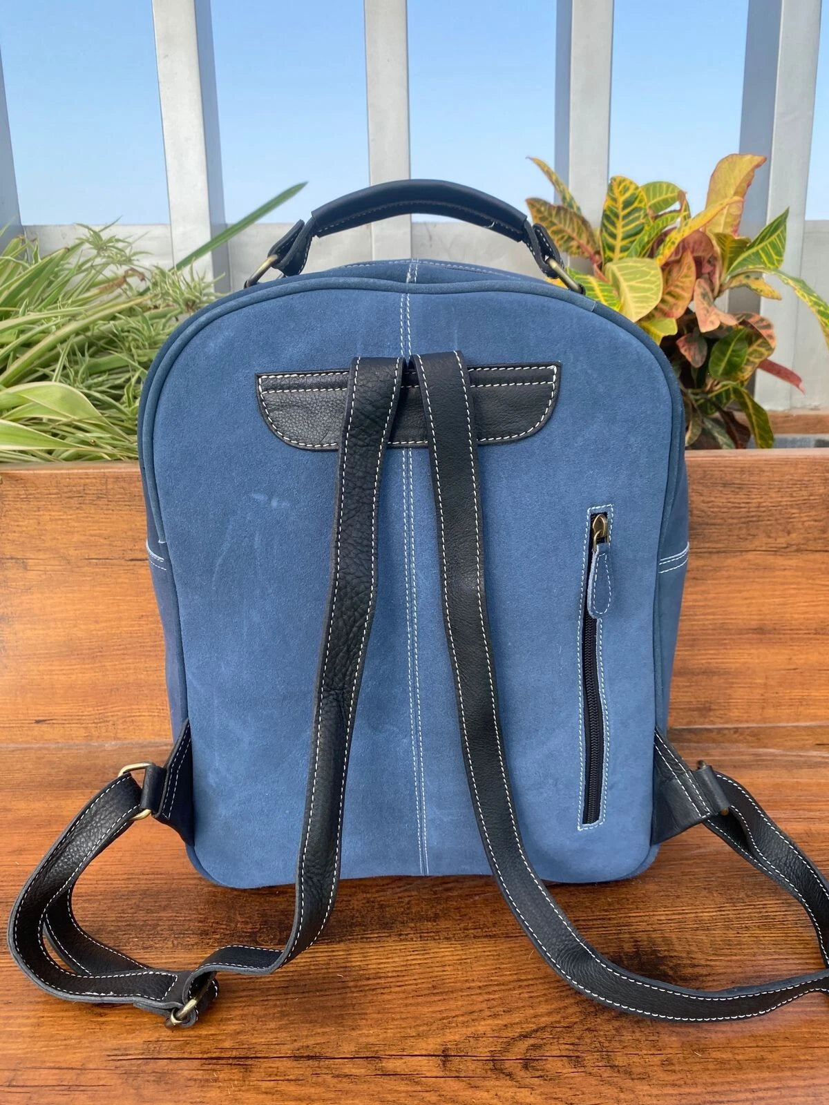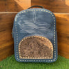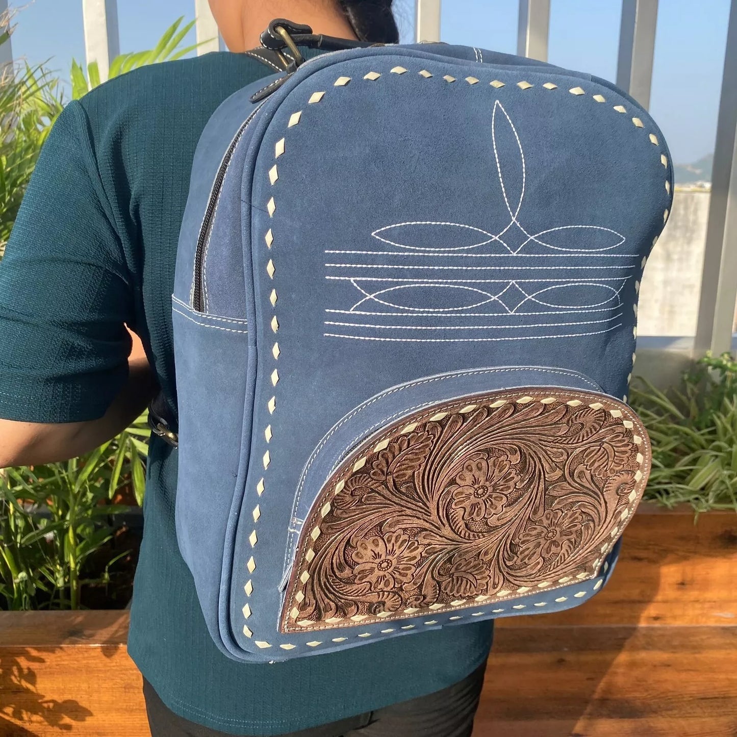 - Handmade blue suede backpack with floral tooled leather front pocket – combines Western texture with standout detail