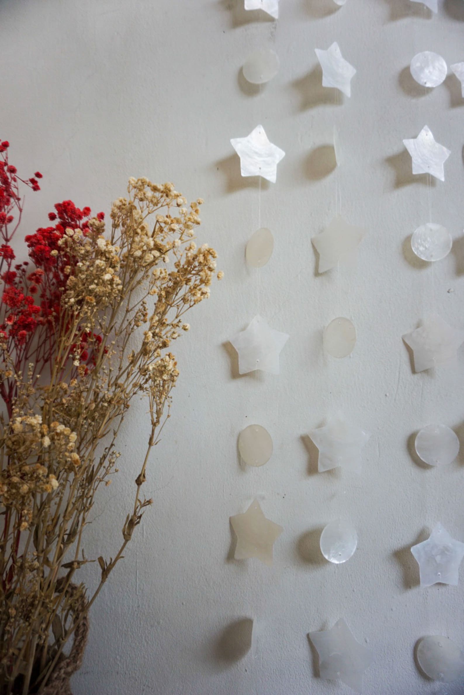 The capiz shell wall hanging, showcases beautiful circular and star-shaped shell pieces carefully suspended in cascading rows. The shells gently sway with the breeze, creating a soft tinkling sound that mimics the calming waves of the sea. Whether you're designing a boho-inspired room, a beachy living space, or even a tranquil nursery, this wall hanging enhances the natural beauty of your surroundings.