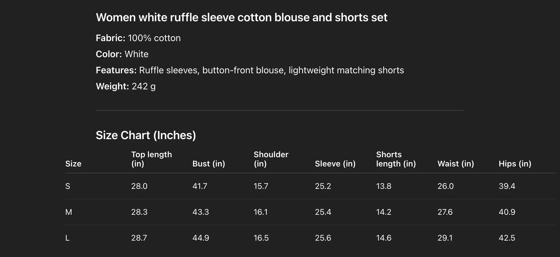 White swiss dot ruffle shirt and shorts set made for warm-weather styling with a lightweight sheer feel and raised dot texture. The button-front long shirt has ruffle trim, a patch pocket, and gathered cuffs, paired with elastic waist shorts for an easy two-piece outfit. Wear it for vacation, brunch, or beach cover-up looks, with simple layering underneath.