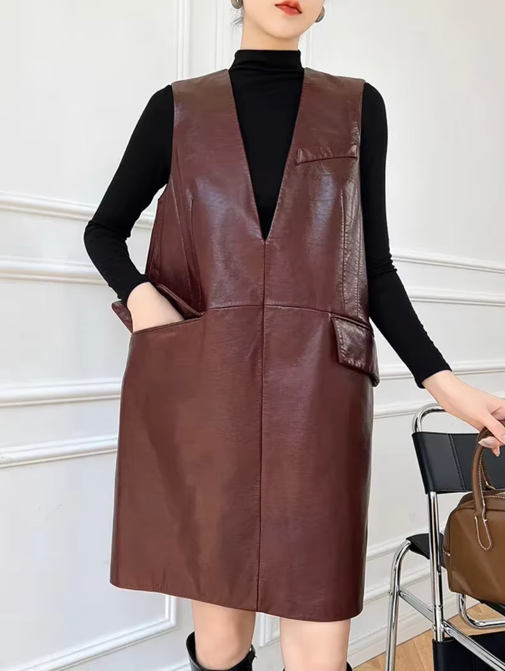 Step into bold sophistication with this wine red genuine sheepskin leather dress vest for women. Designed in an oversized sleeveless silhouette, it merges the appeal of a leather dress with the ease of a layering vest. The deep V-neckline, front flap pockets, and chest welt pocket create sharp lines while keeping functionality in focus. Tailored from genuine sheepskin leather, its smooth back panel and premium texture highlight the richness of the material. Ideal for styling as a leather dress women can wear with boots or layered over turtlenecks, it also connects with searches for women mini leather dress and short leather dress for women.