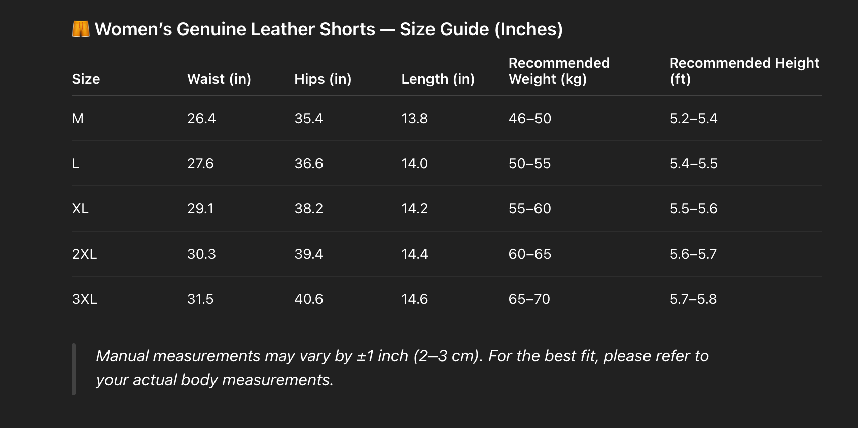 - It takes approx seven business days to complete each women’s genuine leather shorts.
