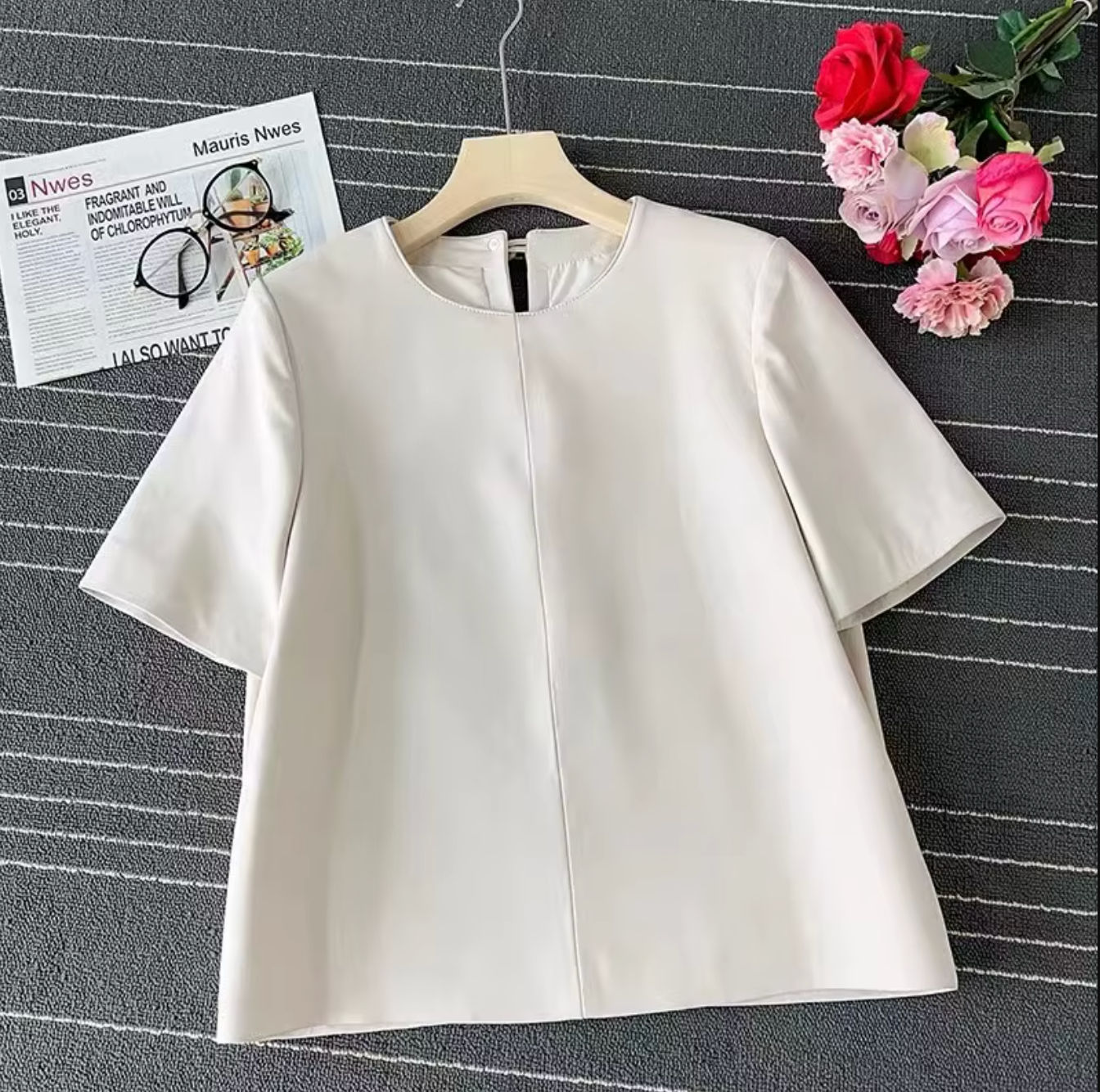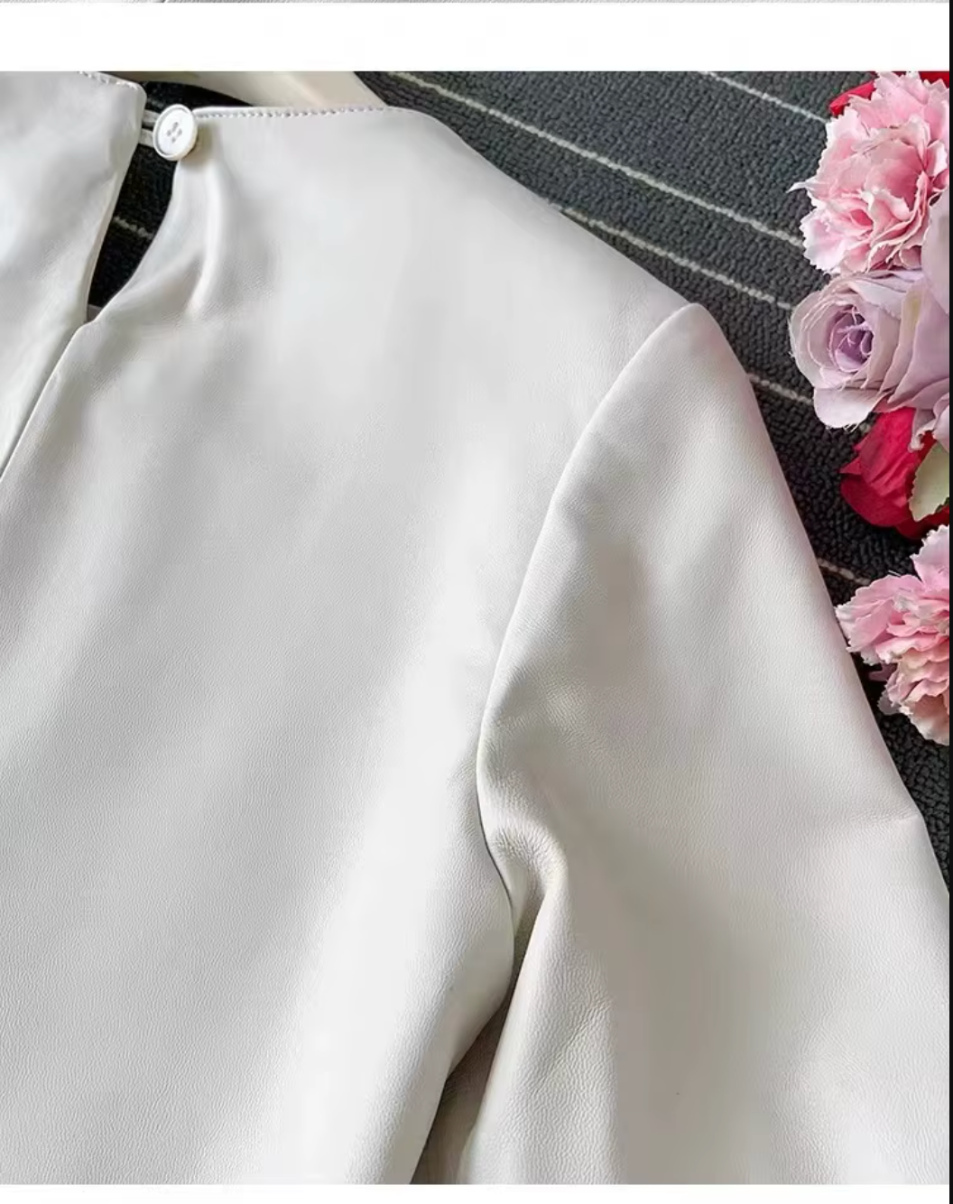 - Premium genuine sheepskin leather blouse with smooth finish and short sleeves