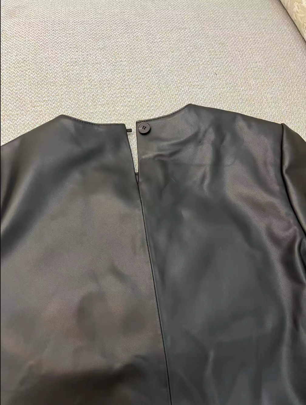 This women’s black leather top is tailored from genuine sheepskin, offering a smooth texture and a polished appearance for everyday wear. Designed with short sleeves and a classic round neckline, this leather blouse for women pairs effortlessly with skirts, jeans, or tailored trousers. The lightweight sheepskin leather provides breathability while maintaining structure, making it ideal for casual or semi-formal occasions. A clean center seam detail and back button closure complete the refined look.