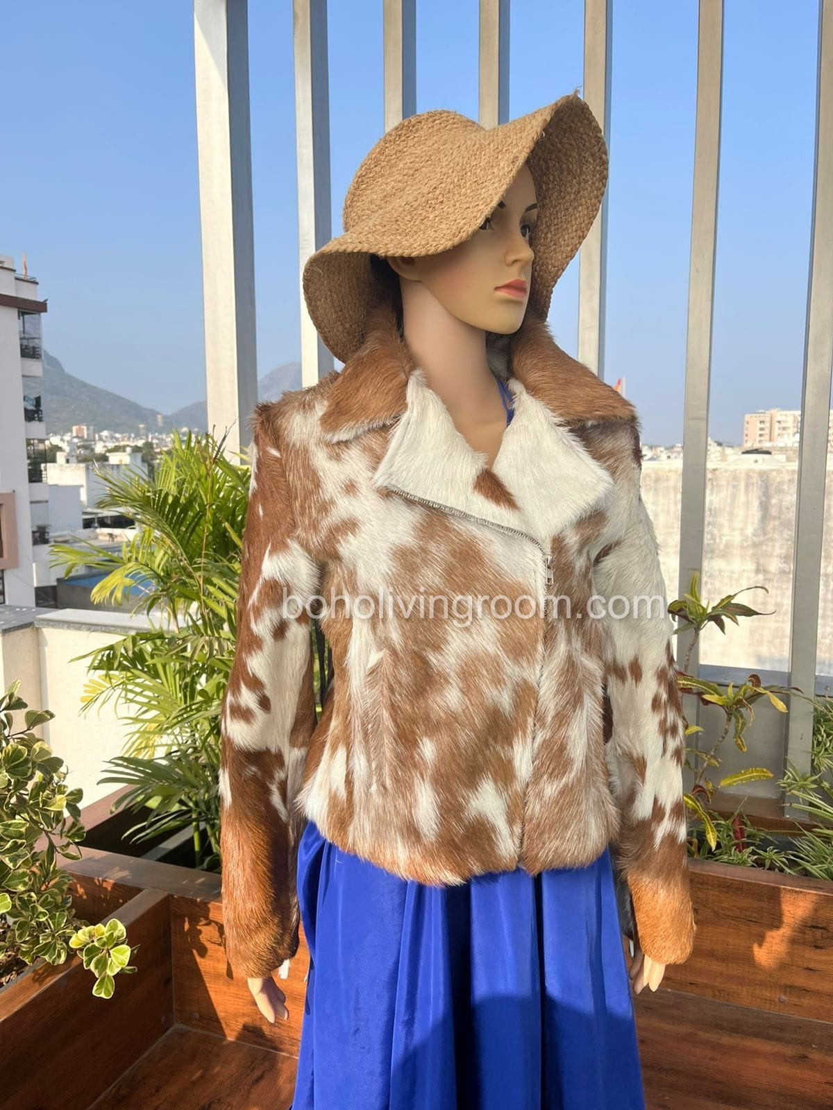 - Made from authentic brown and white cowhide fur – each jacket is naturally patterned for uniqueness