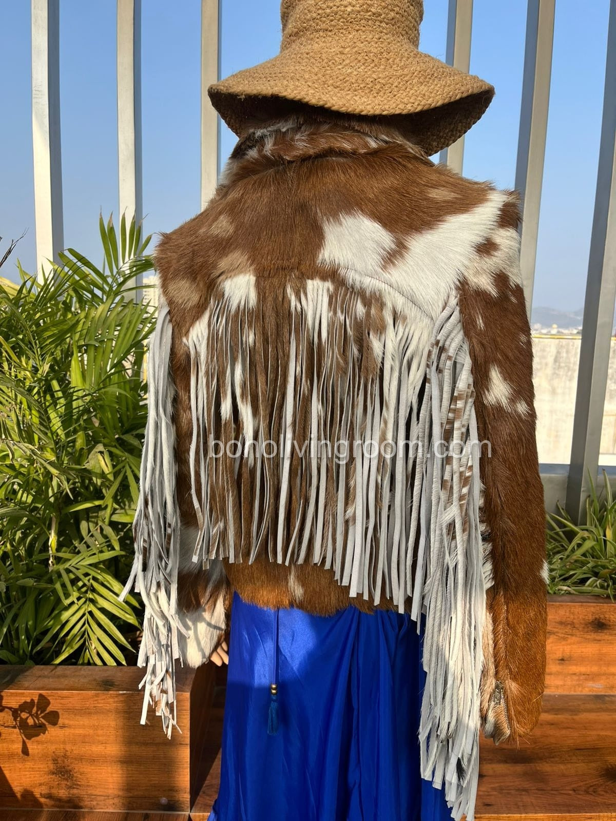 Women's Cowhide Jacket with Fringe – Real Cow Print Leather Fur Coat