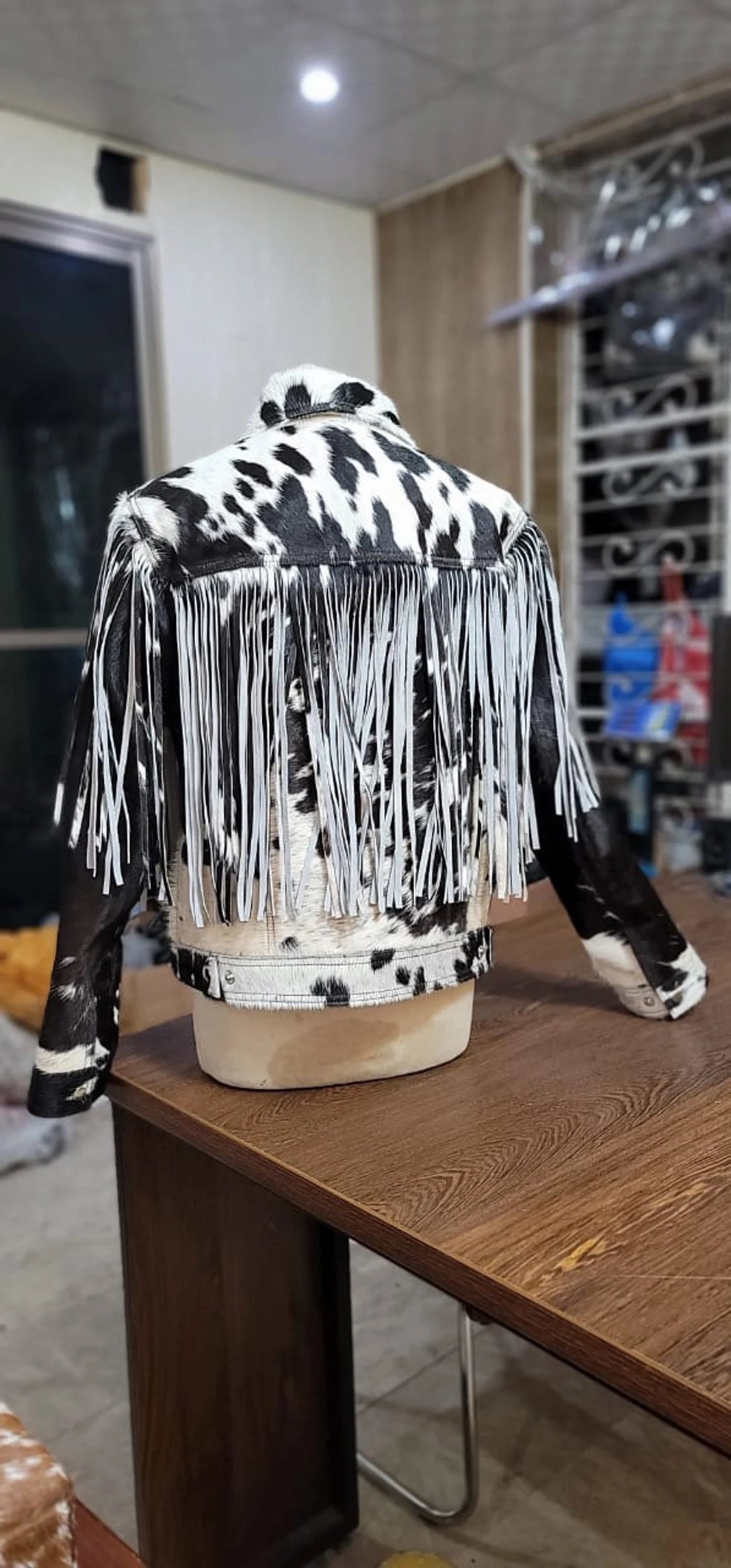 Step into the spotlight with this cowhide jacket women will love for its distinct texture and fringe details. Designed from premium cowhide leather, this piece blends natural patterns with a western-inspired finish. The cow fur coat creates a unique layering option that pairs effortlessly with denim, skirts, or dresses.
