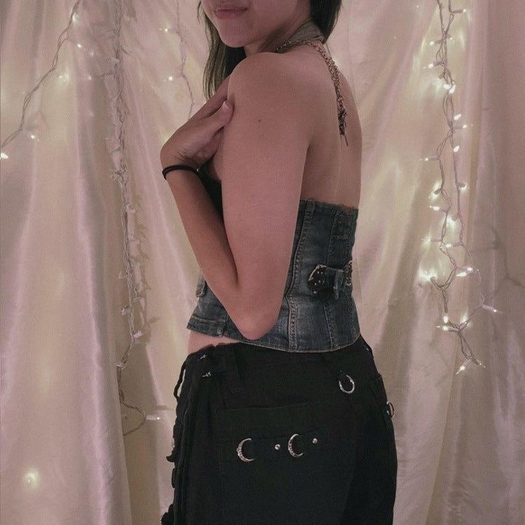 Women’s Denim Corset Halter Top Retro Distressed