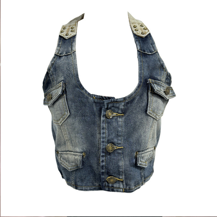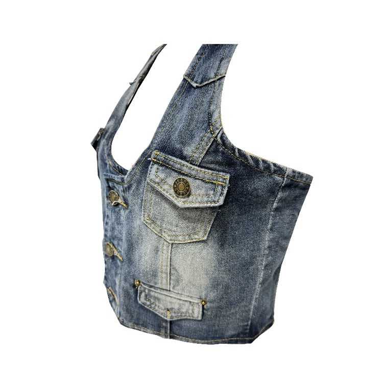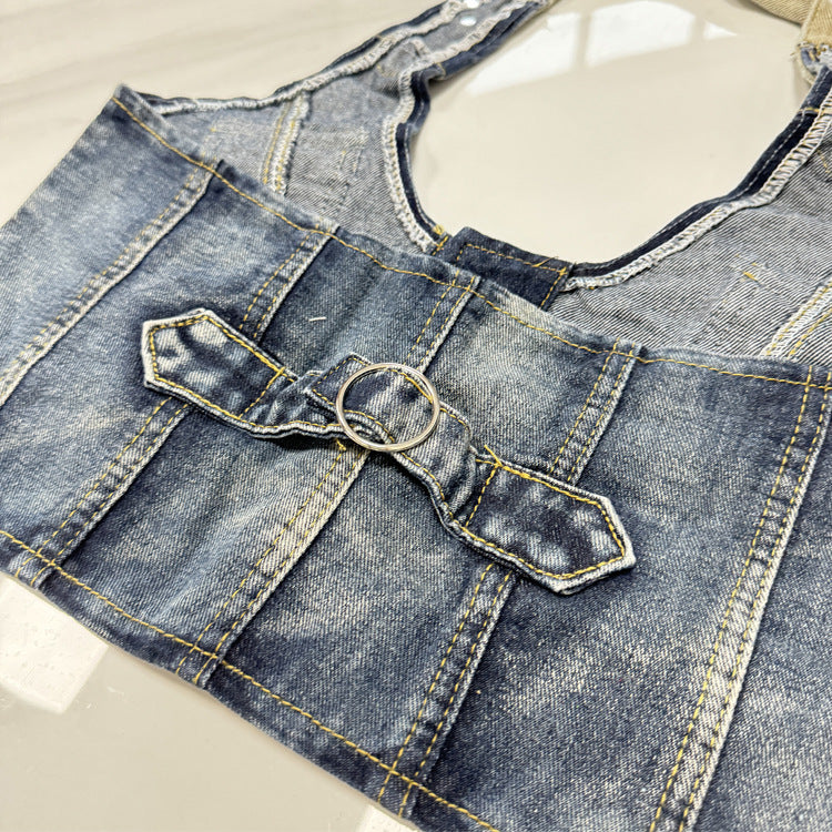 Retro Distressed Women’s Denim Corset Halter Vest Top