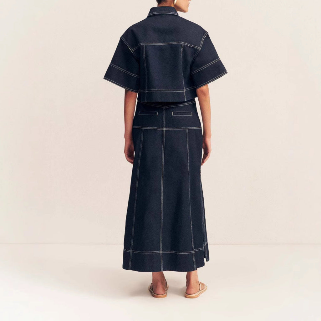 • Two piece denim set includes short-sleeved boxy shirt and matching mid-length skirt