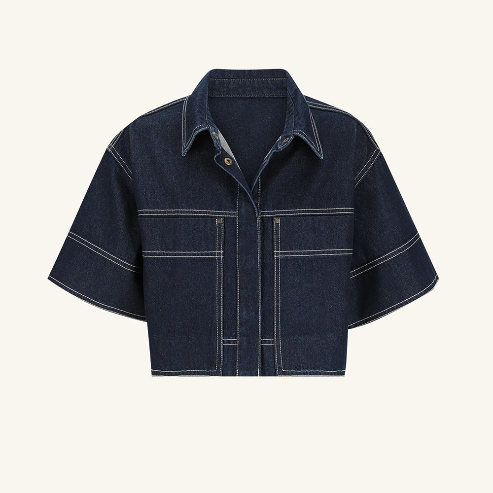 • Two piece denim short set vibe with sleek tailoring and bold seam design
