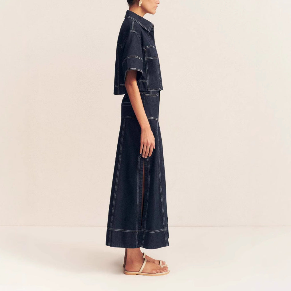 • Skirt denim set designed with high waist, clean lines, and deep slit detail