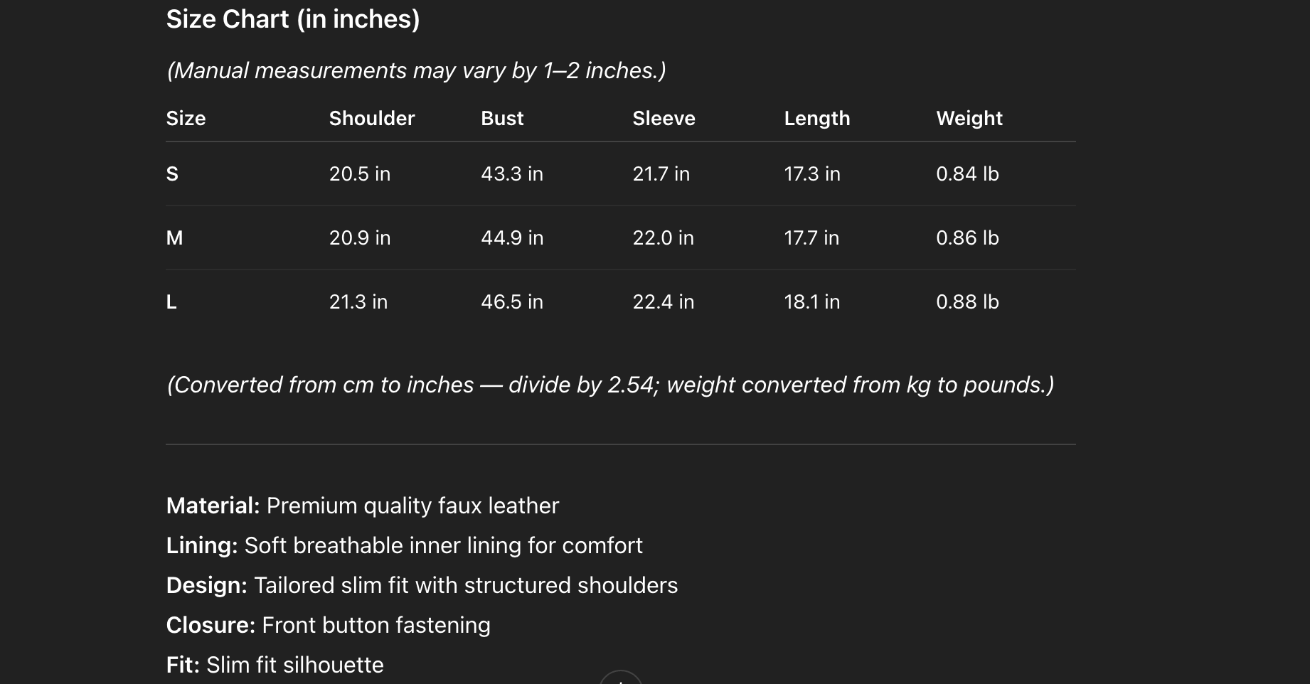 - Please check the size chart correctly before placing the order. If you need any assistance, feel free to message us. Each faux leather cropped jacket involves significant cost and craftsmanship, and we work on very small margins.