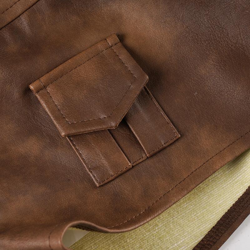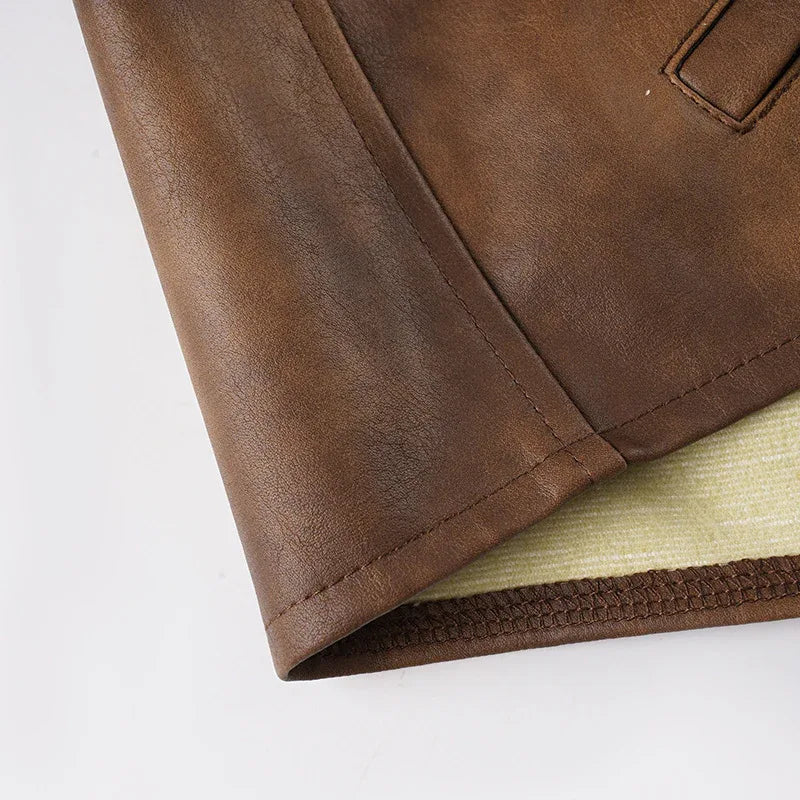 • Faux leather finish with warm brown tones matches the zipper tabs, metal button, and belt loops