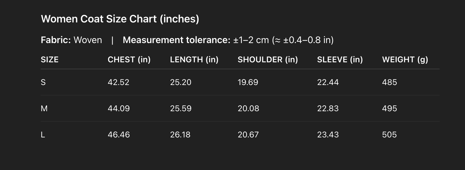 - Reinforced stitching and clean panel quilting for improved garment strength and shape retention