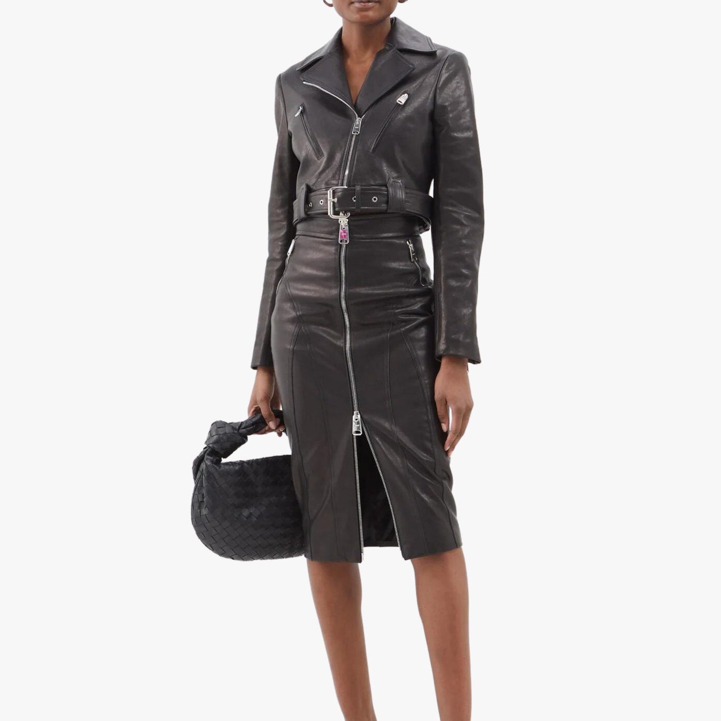 Explore the nuances of style with this exquisitely made leather pencil skirt that effortlessly infuses a bold element into your sophisticated wardrobe. Delicately adorned and meticulously planned, this piece exemplifies the craftsmanship of premium fashion.