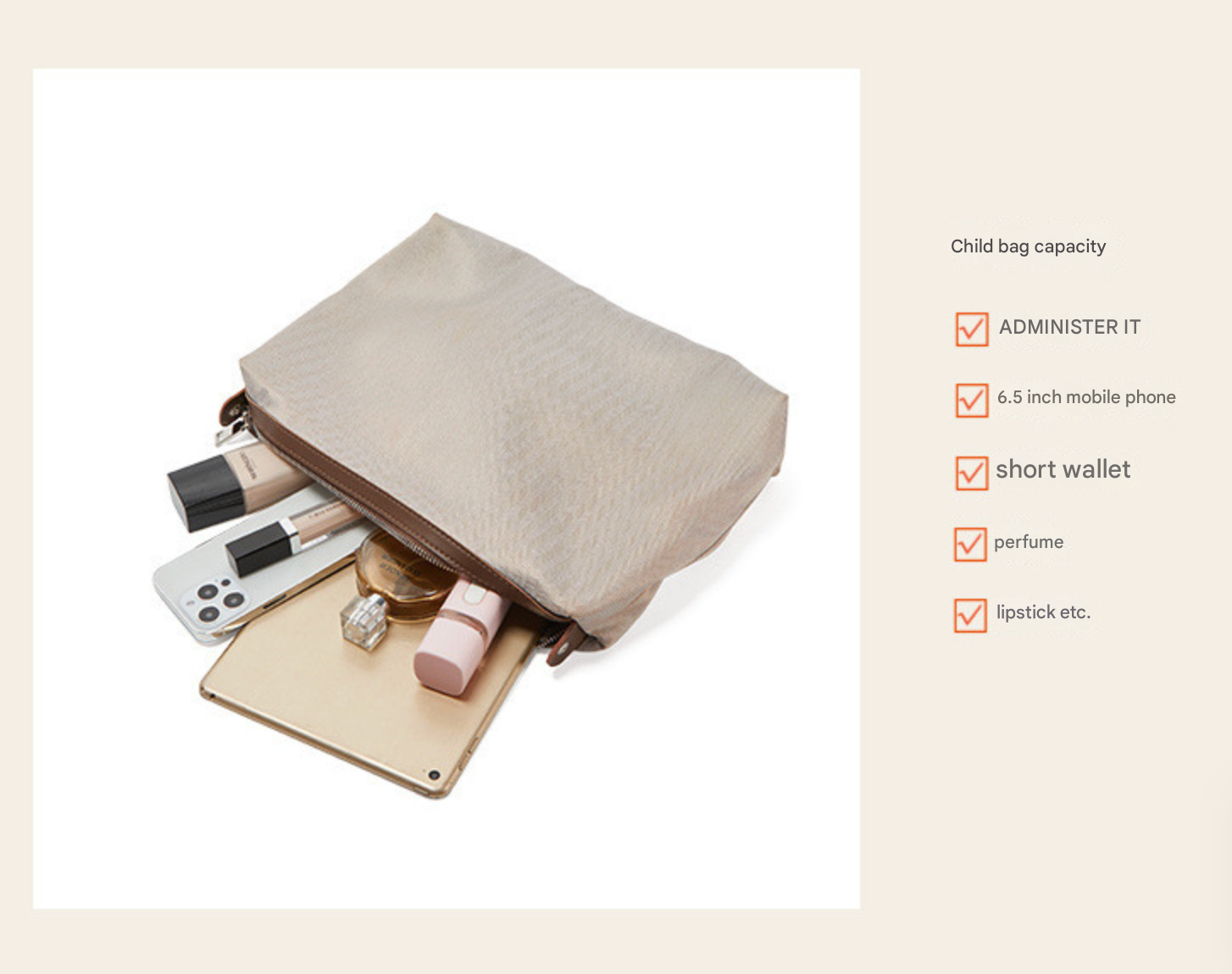 - Includes a zippered sub-bag for your phone, short wallet, perfume, and lipstick — perfect for keeping essentials organized.