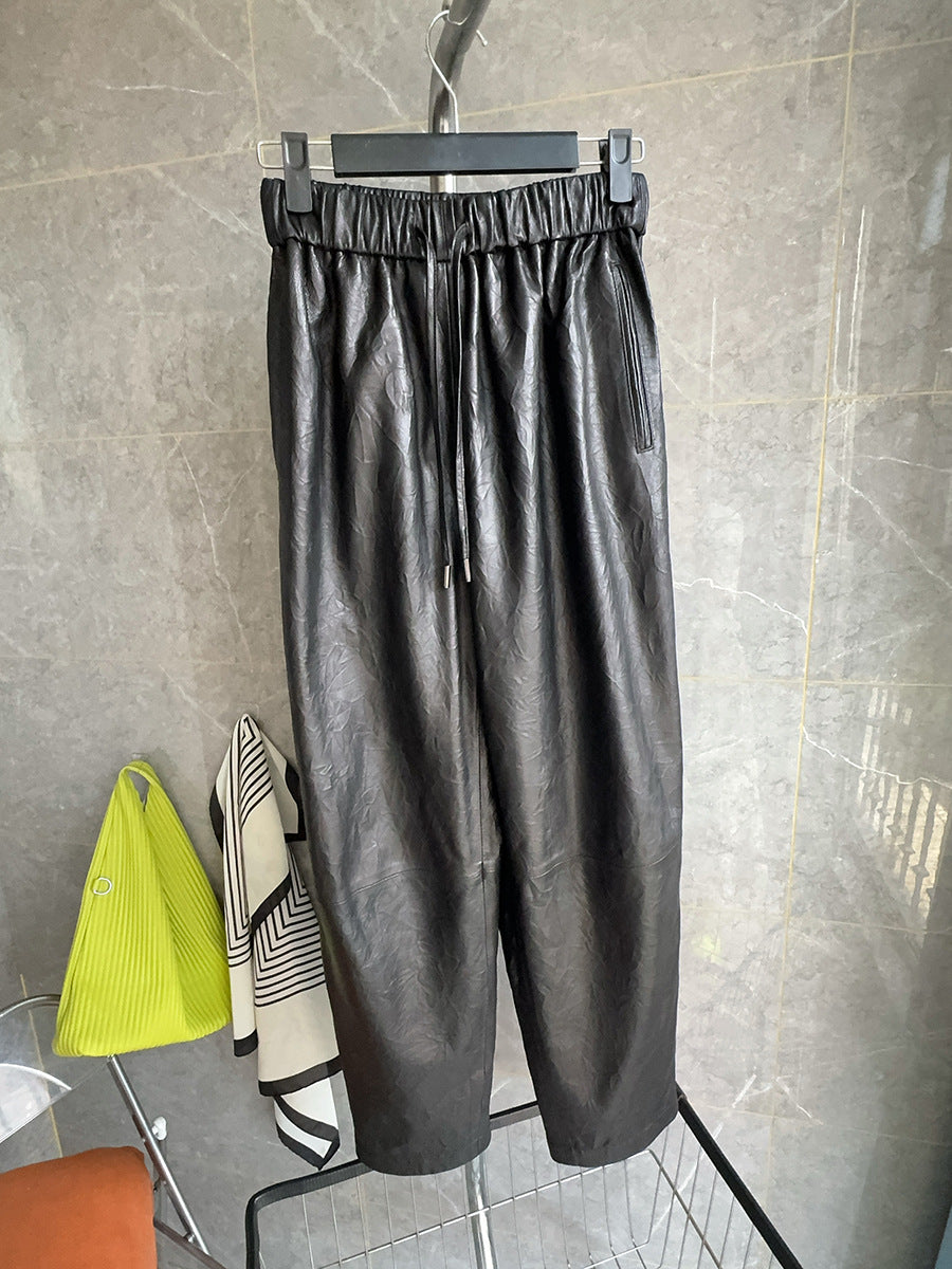 Women Genuine Leather Trousers Elastic Waist Carrot Pants