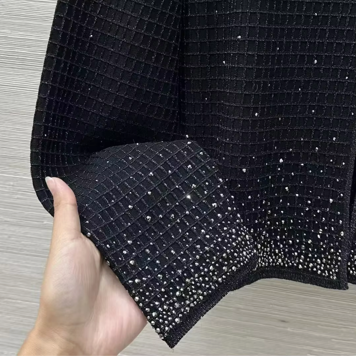 The Women Gold Thread Plaid Rhinestone Knit Three Piece Set combines a modern silhouette with a radiant gold wire plaid finish for a statement-ready look. This black rhinestone knit jacket with pants and camisole set delivers luxury detailing and structured design made to command attention. Each piece is fabricated from a gold wire plaid women rhinestone outfit set blend that captures light while maintaining breathable comfort. The sleeveless vest layers beneath a crystal-trimmed jacket and full-length pants to create a refined, polished profile. This rhinestone knit set showcases expert craftsmanship, ensuring consistent texture, symmetrical sparkle alignment, and premium knit stretch. The women plaid jacket complements the gold thread top, creating a visually cohesive, camera-friendly outfit ideal for evening occasions, special events, or formal gatherings.