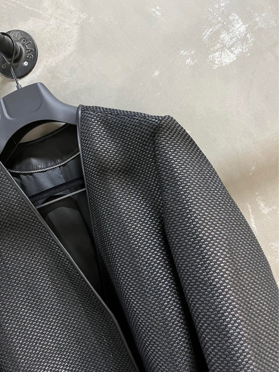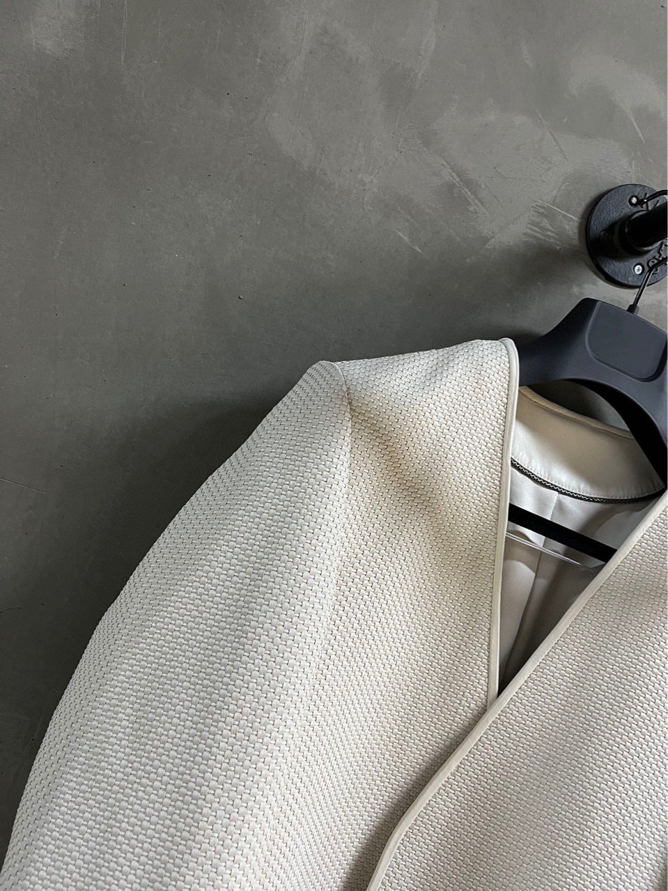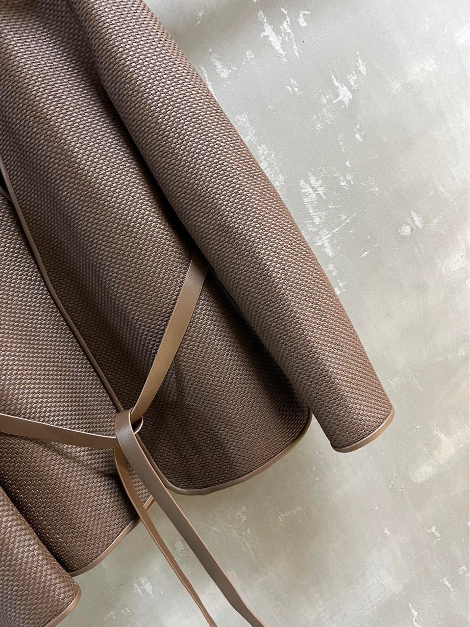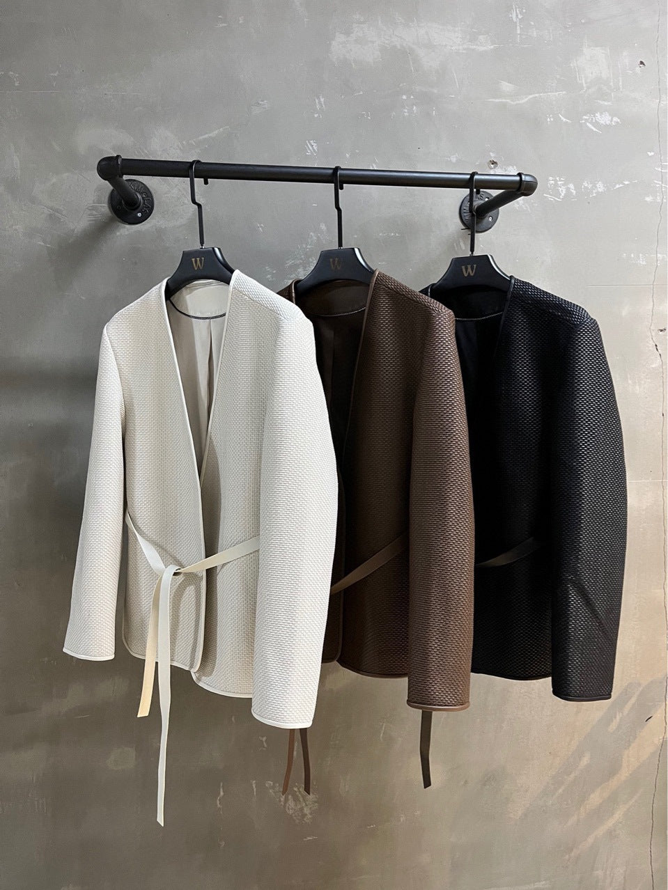 This women hand woven leather jacket delivers modern texture with a lightweight open-front silhouette. Designed with an adjustable leather belt, it offers flexible styling for business casual and evening wear. Available in ivory, coffee brown, and black, each jacket is fully lined for comfort and layering. The woven leather surface enhances depth and durability, while the clean structure ensures timeless appeal. A versatile open front leather jacket with belt, it balances refined detailing with daily wearability. Perfect for shoppers searching for a woven leather jacket or women leather jacket.