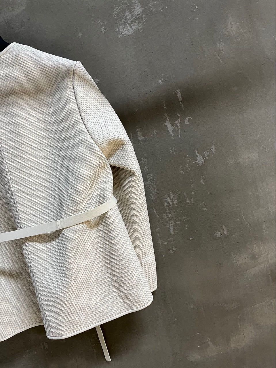 - Lightweight open-front leather jacket with belt for an adjustable and tailored fit
