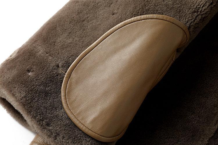 - Wide turn-down collar lined with dense shearling adds contrast texture and visual depth