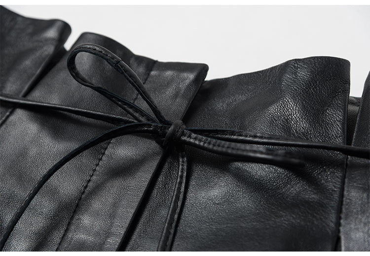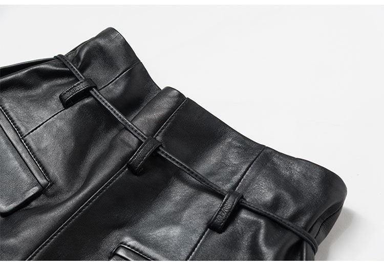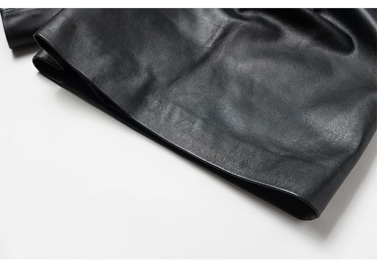 Step into autumn and winter with these women leather shorts made from genuine sheepskin. Designed with a high waist leather shorts for women silhouette, the pleated lace-up detail defines the waist while the wide leg cut ensures comfort and movement. The buttery soft sheepskin surface offers a smooth, refined finish, while YKK zippers and rear flap pockets add both style and function. Perfect to pair with boots or heels, these leather shorts women work seamlessly with casual or statement tops.