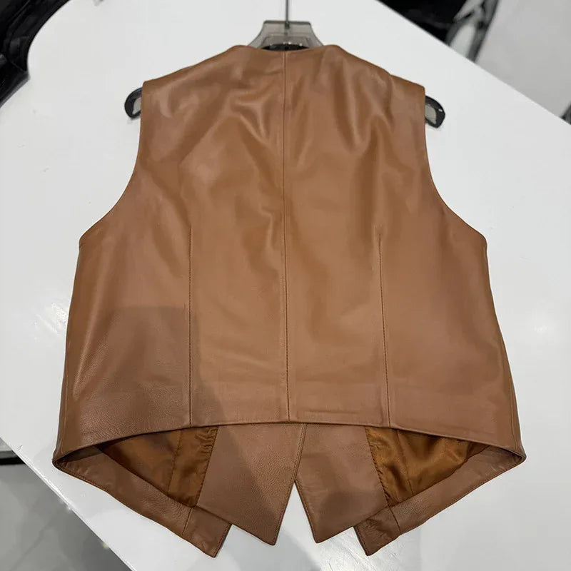 - Neutral camel-brown tone pairs with trousers, denim, and skirts, making it ideal as an office women genuine leather vest option for meetings and dinners.