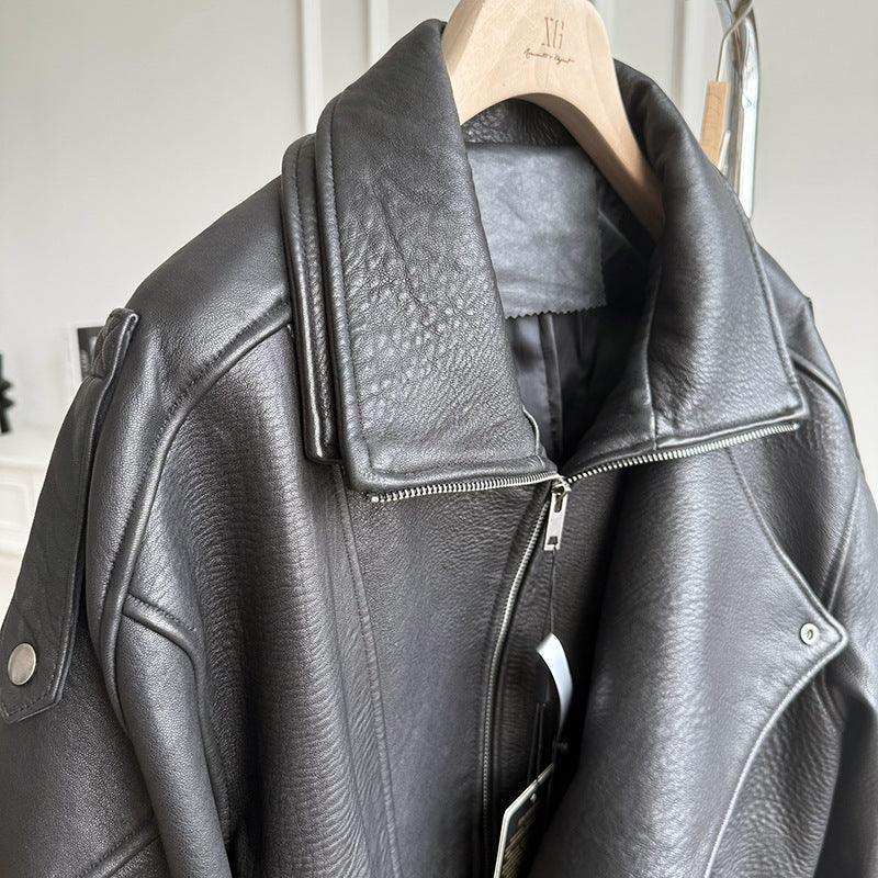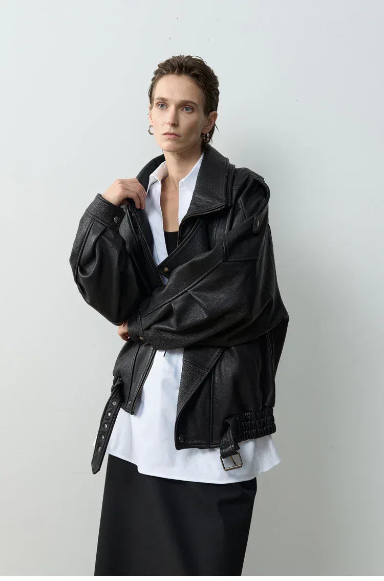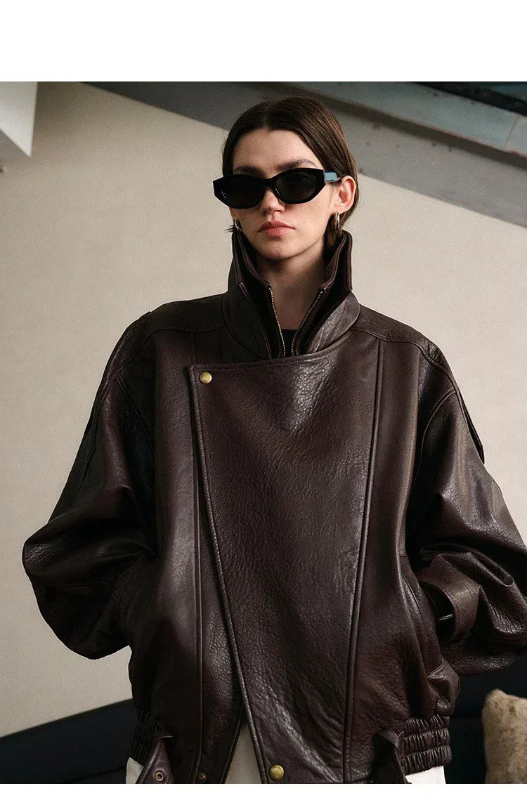 Oversized Genuine Leather Bomber Jacket Women – Loose Fit Moto Outerwear