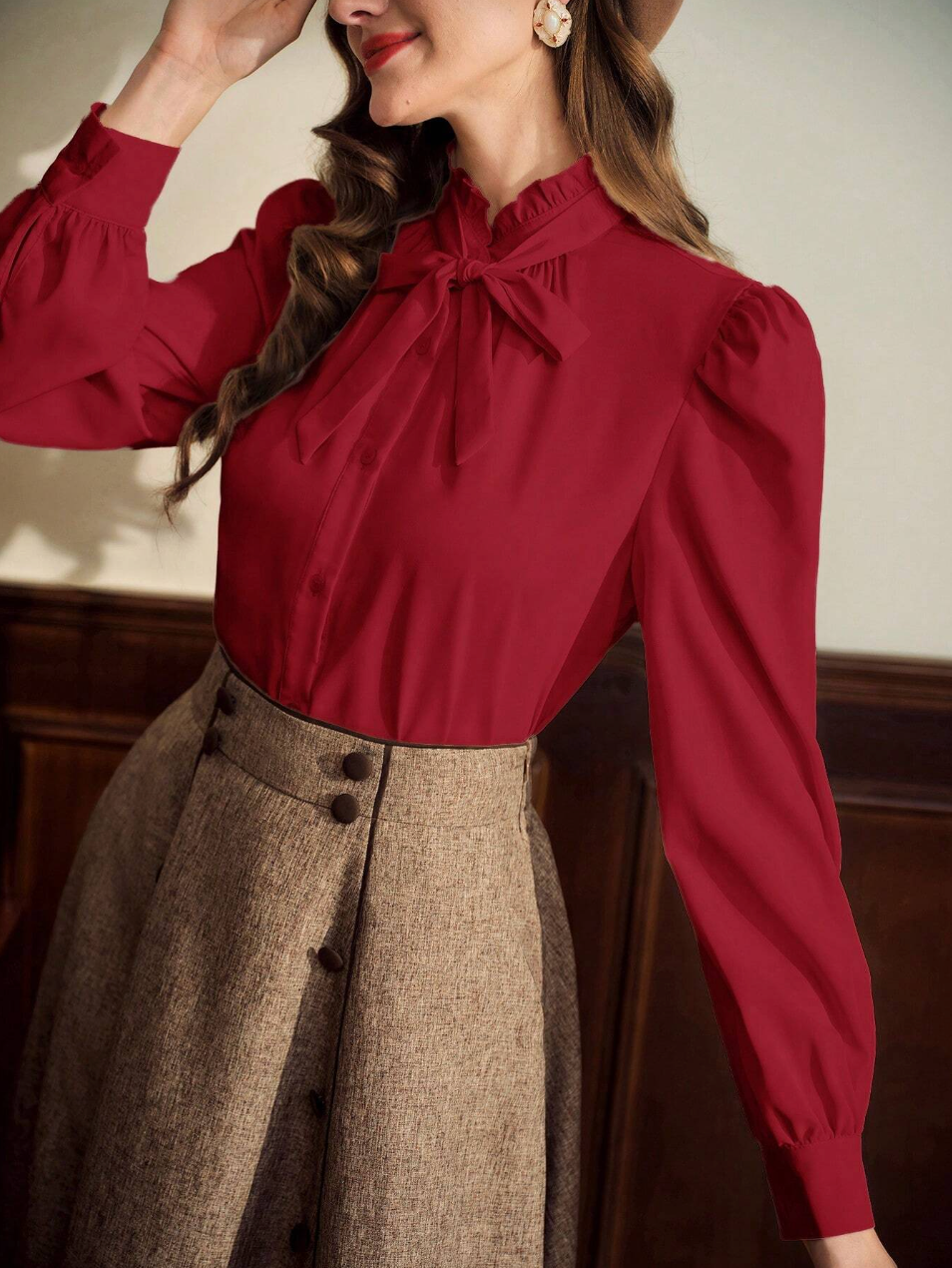Women Loose Fit Shirt with solid Print and Bowknot Neckline