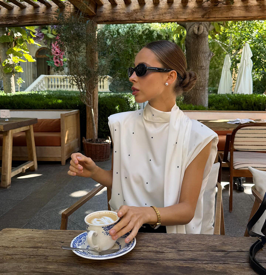 Designed for contemporary dressing, this women polka dot sleeveless backless blouse features a structured stand collar tie bow top silhouette with a flowing satin drape. The split back accent and long bow closure add a sophisticated, airy effect, making it ideal for professional or leisure settings. Crafted from high-quality polyester satin, this elegant split back draped satin sleeveless vest blends soft texture with refined movement. The minimalist dotted pattern ensures effortless coordination with tailored pants, culottes, or skirts. A must-have polka dot blouse that transitions from meetings to café moments with confidence and ease.