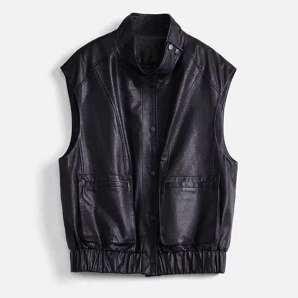Women’s Real Leather Vest with Stand Collar and Front Pockets