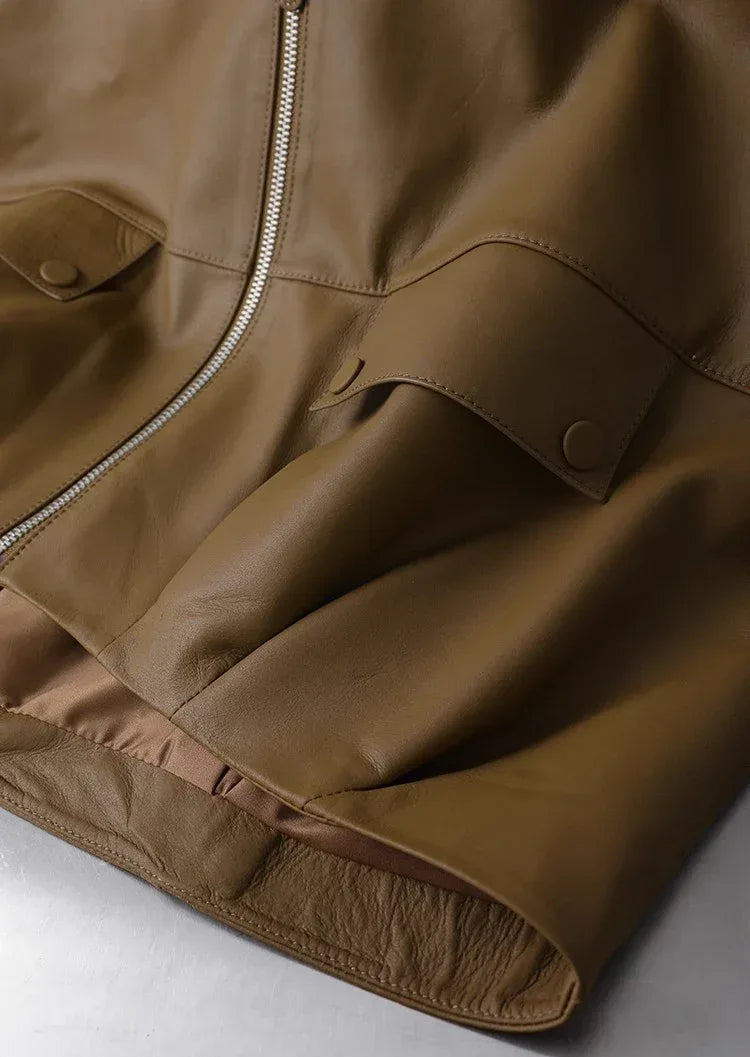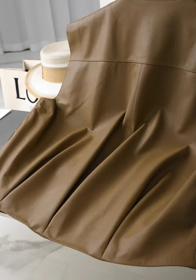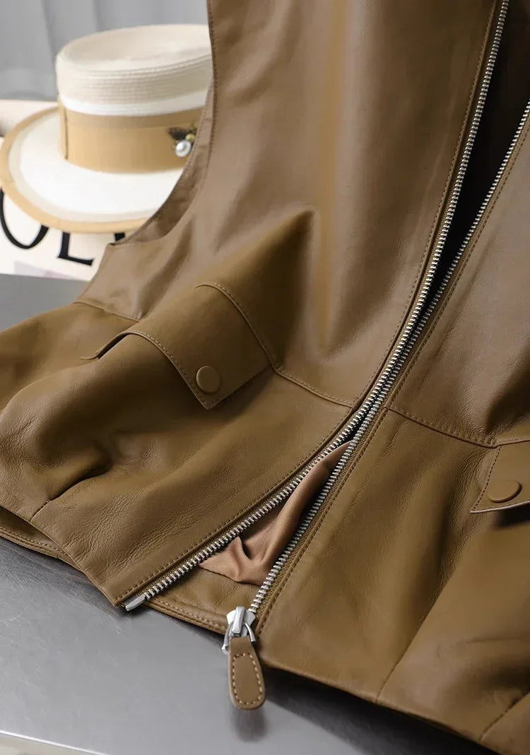 • Smooth genuine sheepskin surface shaped into a women brown leather zip vest design, offering a polished appearance suitable for office routines