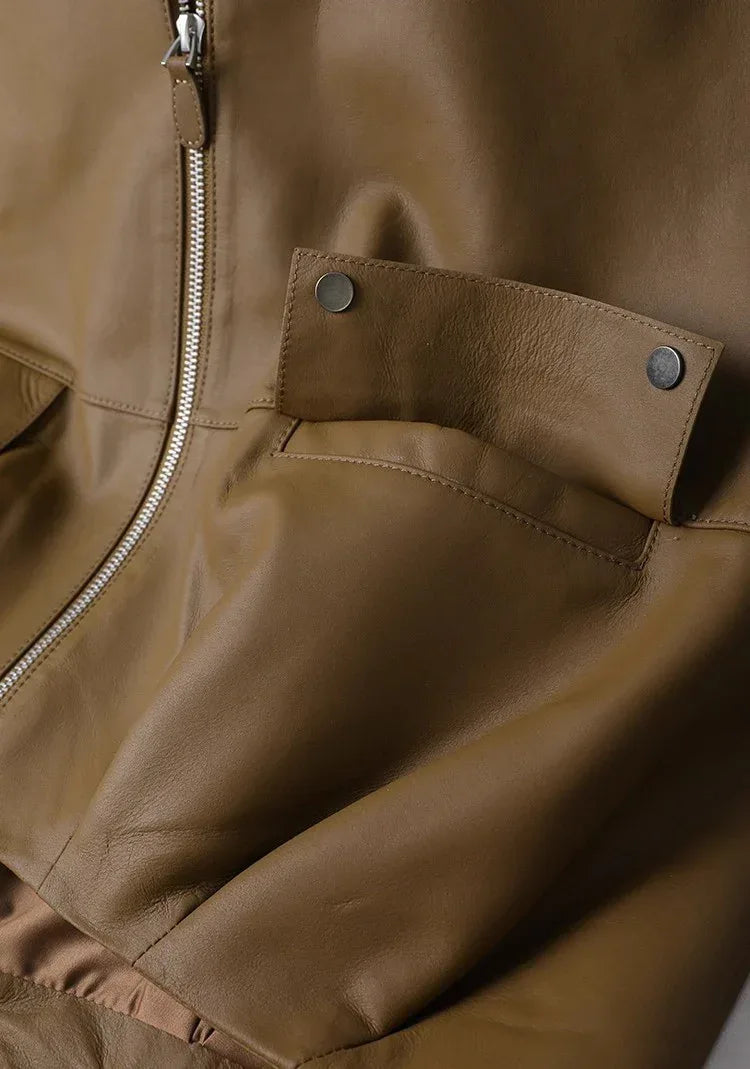 This women brown leather zip vest blends genuine sheepskin with a clean office-ready finish, making it a strong match for tailored outfits and everyday layering. The design follows the structure seen in the images: a smooth front panel, full metal zipper, rounded neckline, and subtle back pleating that creates a balanced silhouette. The soft interior lining allows the vest to layer over shirts or knit tops without adding bulk, supporting long-hour wear in work environments. The snap-button pockets add a functional touch while keeping the profile minimal. This genuine leather Old Money vest for women uses controlled shaping to maintain a polished look across different outfits, and its brown tone pairs easily with neutral pieces.