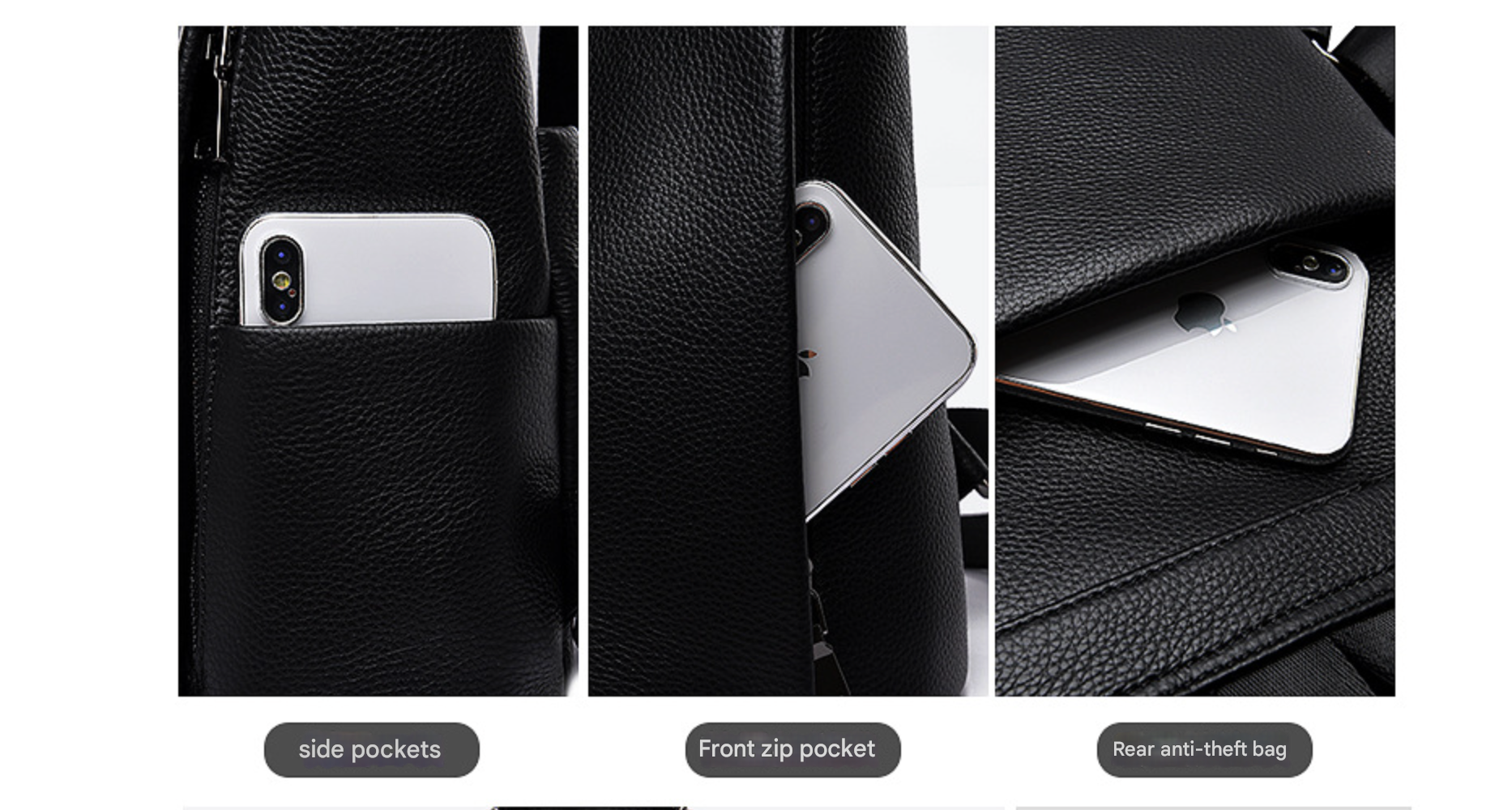 • This women leather backpack bag includes front and side storage pockets as displayed, ideal for quick-access items like mobile phones.