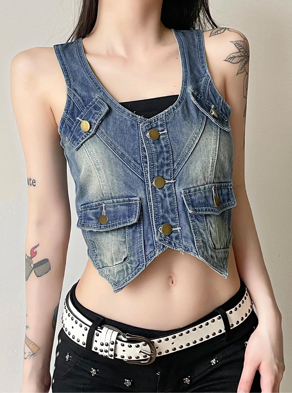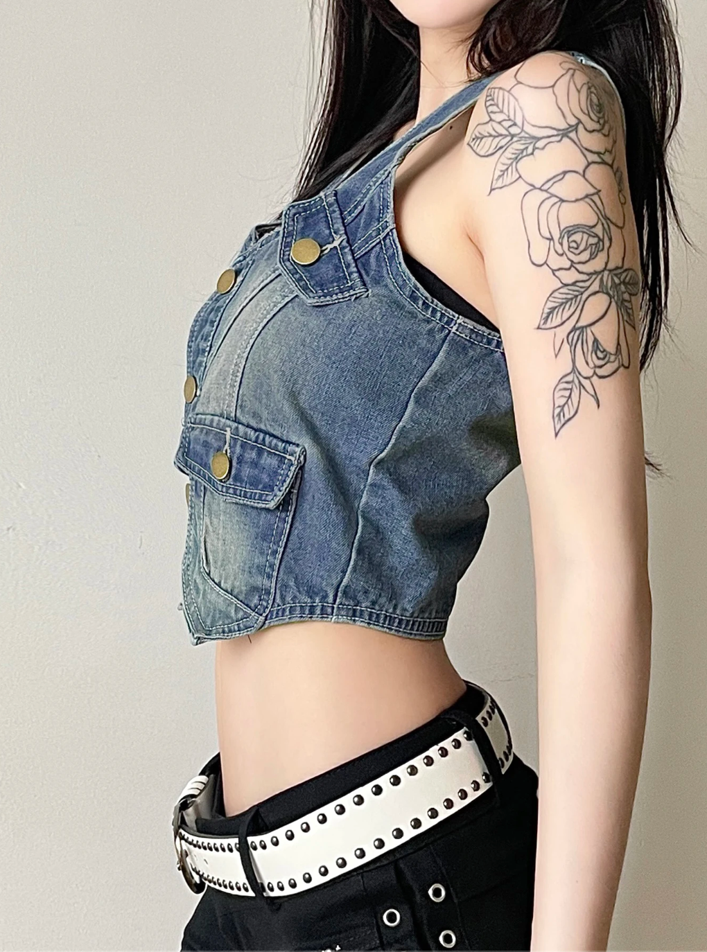 - Lightweight cropped denim vest for streetwear styling across all seasons