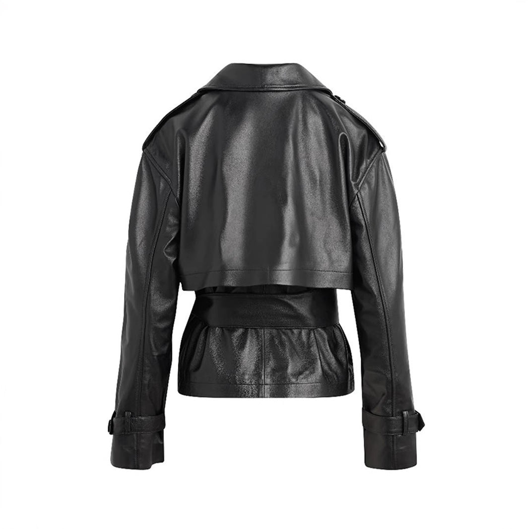 Bring definition and edge to your wardrobe with this women’s faux leather belted short jacket in black. Designed with a cropped waist and adjustable belt, it creates a slimming shape perfect for pairing with denim or skirts. The double-breasted closure, wide lapel collar, and cuff straps add strong street fashion appeal. This black short faux leather jacket balances structure and comfort with a smooth lining for everyday wear. A versatile layering piece, it transitions effortlessly from casual city days to night outings.