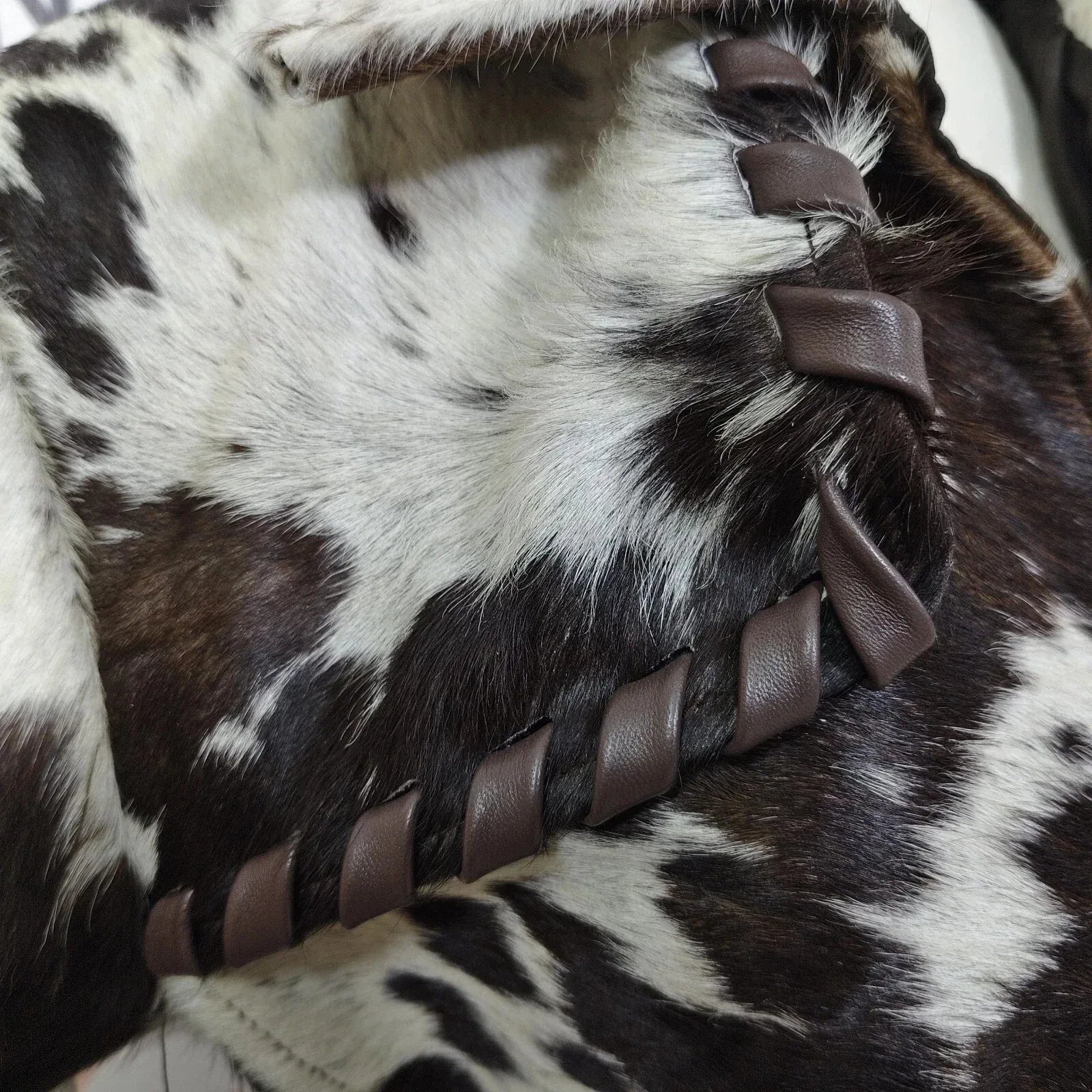 • Hand-laced leather edging on the seams adds a strong visual detail, fully visible in the close-up photo