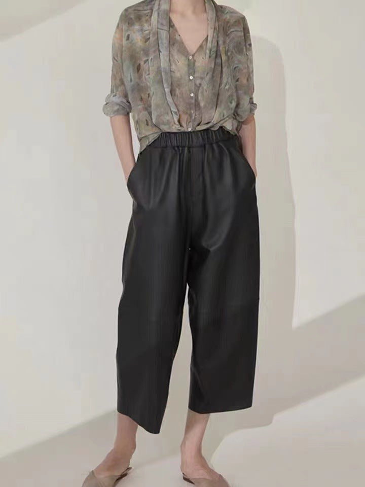 - Wide leg cropped trousers crafted from genuine sheepskin leather for a luxurious soft touch