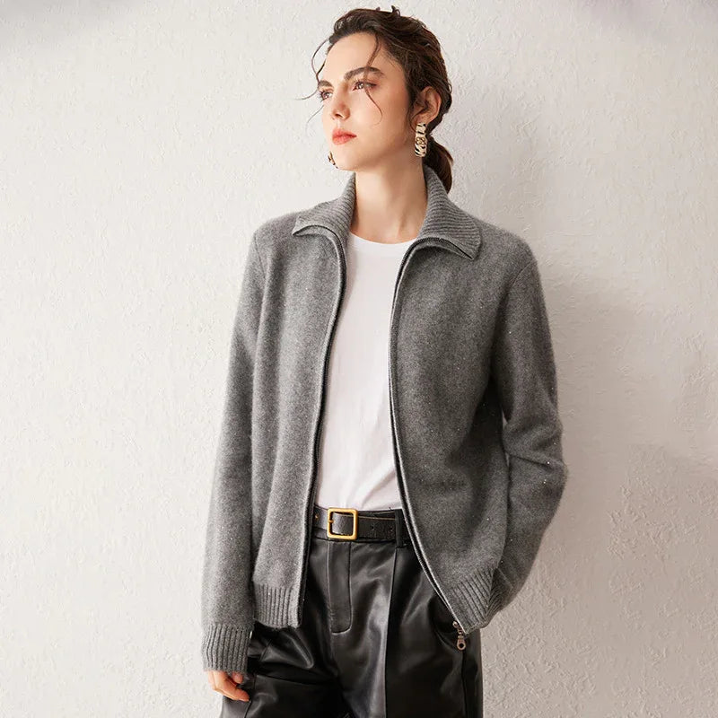 Pure Cashmere Lapel Zip-Up Cardigan for Women